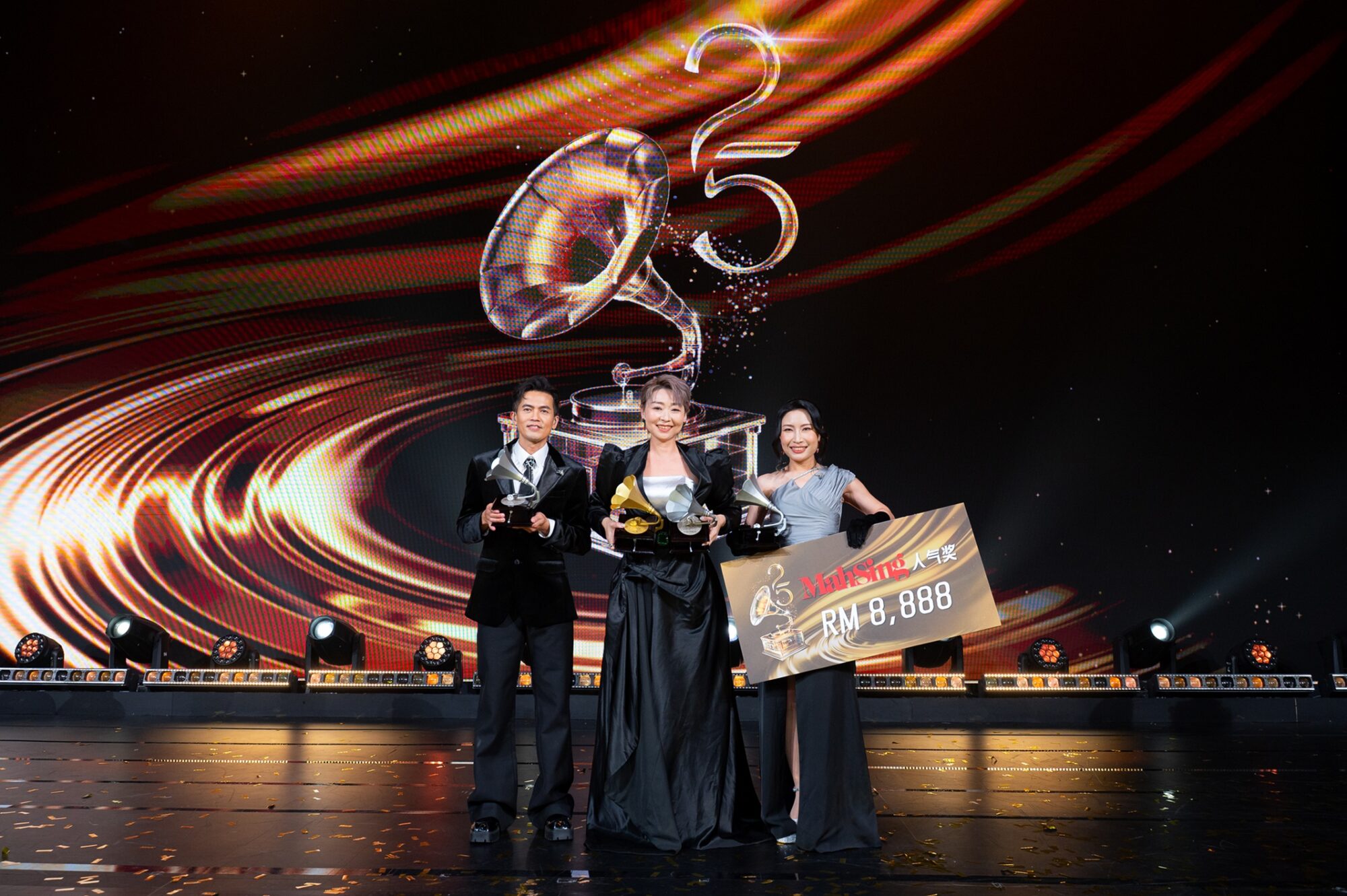 《Astro经典名曲歌唱大赛2025》亚军洪健丰(左起)冠军谢晓莹及马星人气奖得主郑文丽