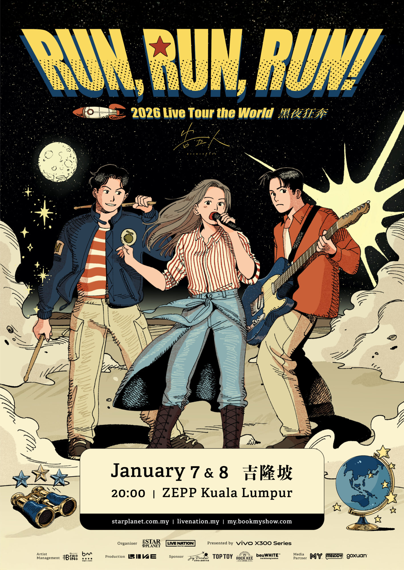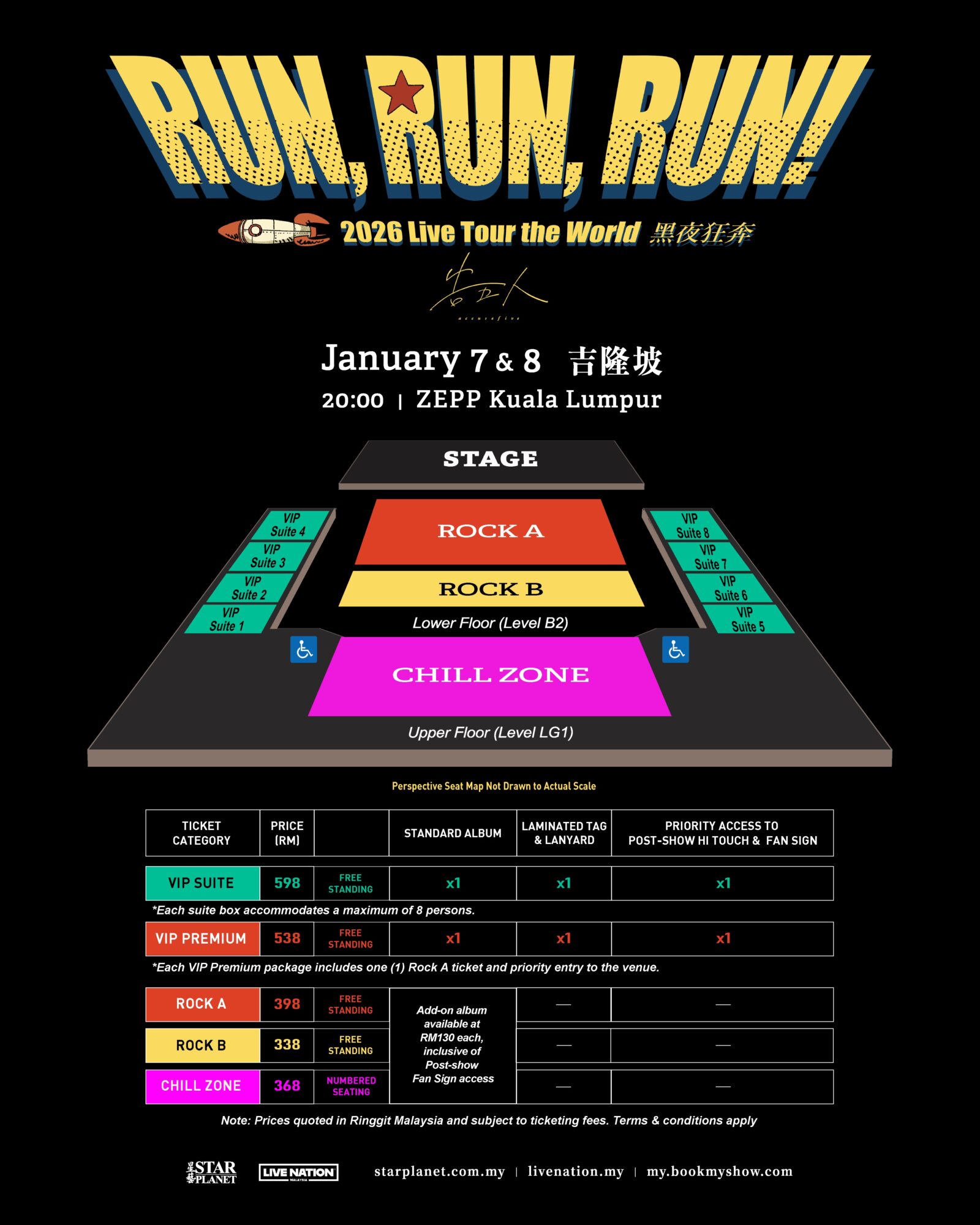告五人《Run, Run, Run! 黑夜狂奔》吉隆坡站 📅日期:2026年1月7日(三)|8日(四) ⏰时间:8.00PM 📍地点:Zepp Kuala Lumpur 🎫票价:VIP SUITE RM598|VIP PREMIUM RM538|ROCK A RM398|ROCK B RM338|CHILL ZONE RM368 🔗票务网址:my.bookmyshow.com