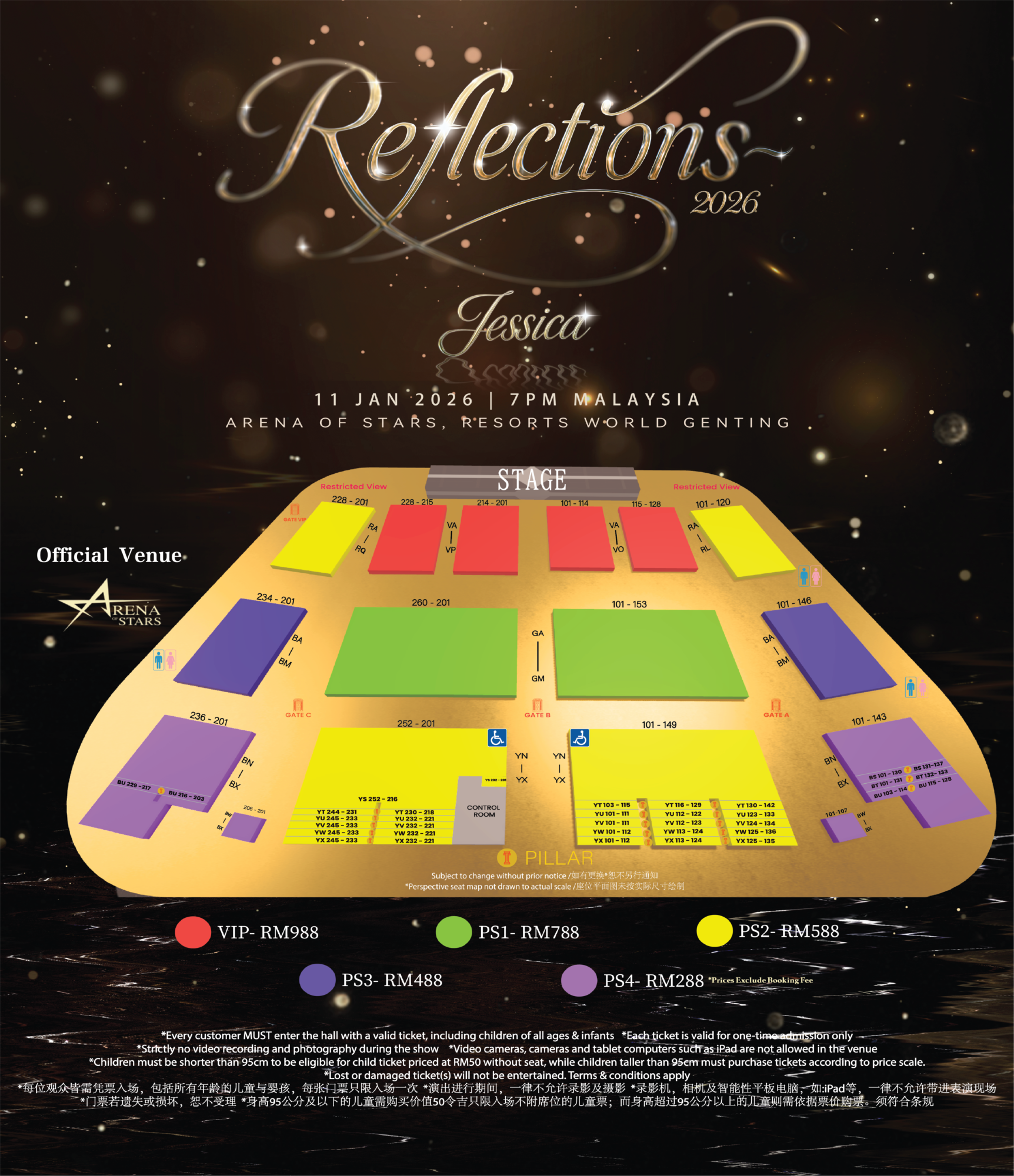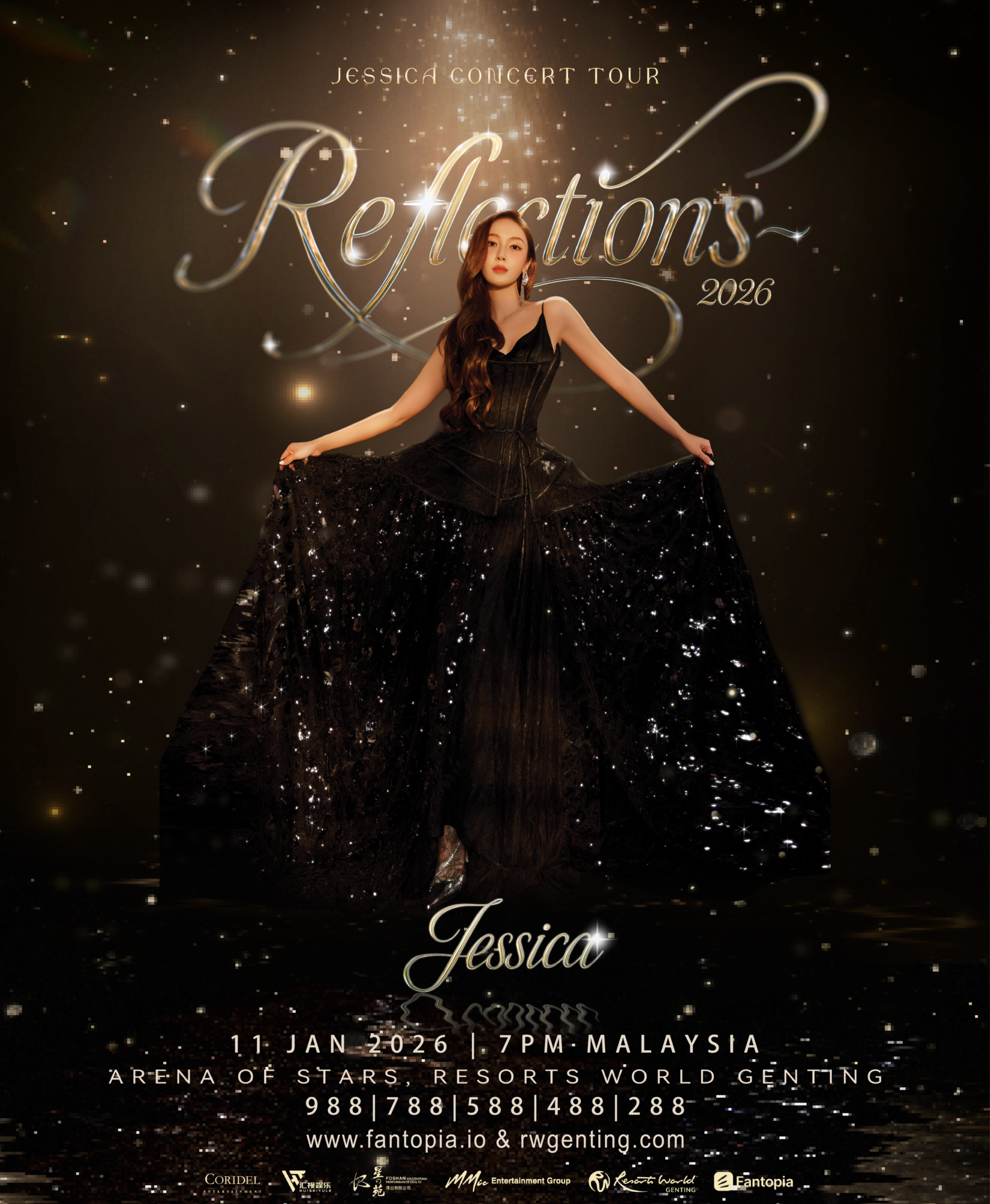 Jessica郑秀妍《Reflections》2026巡演-马来西亚站 📅日期:2026年1月11日(星期日) ⏰时间:7.00PM 📍地点:云顶世界云星剧场 🎫票价:VIP RM988|PS1 RM788|PS2 RM588 |PS3 RM488|PS4 RM288 🔗售票网址:www.fantopia.io |rwgenting.com