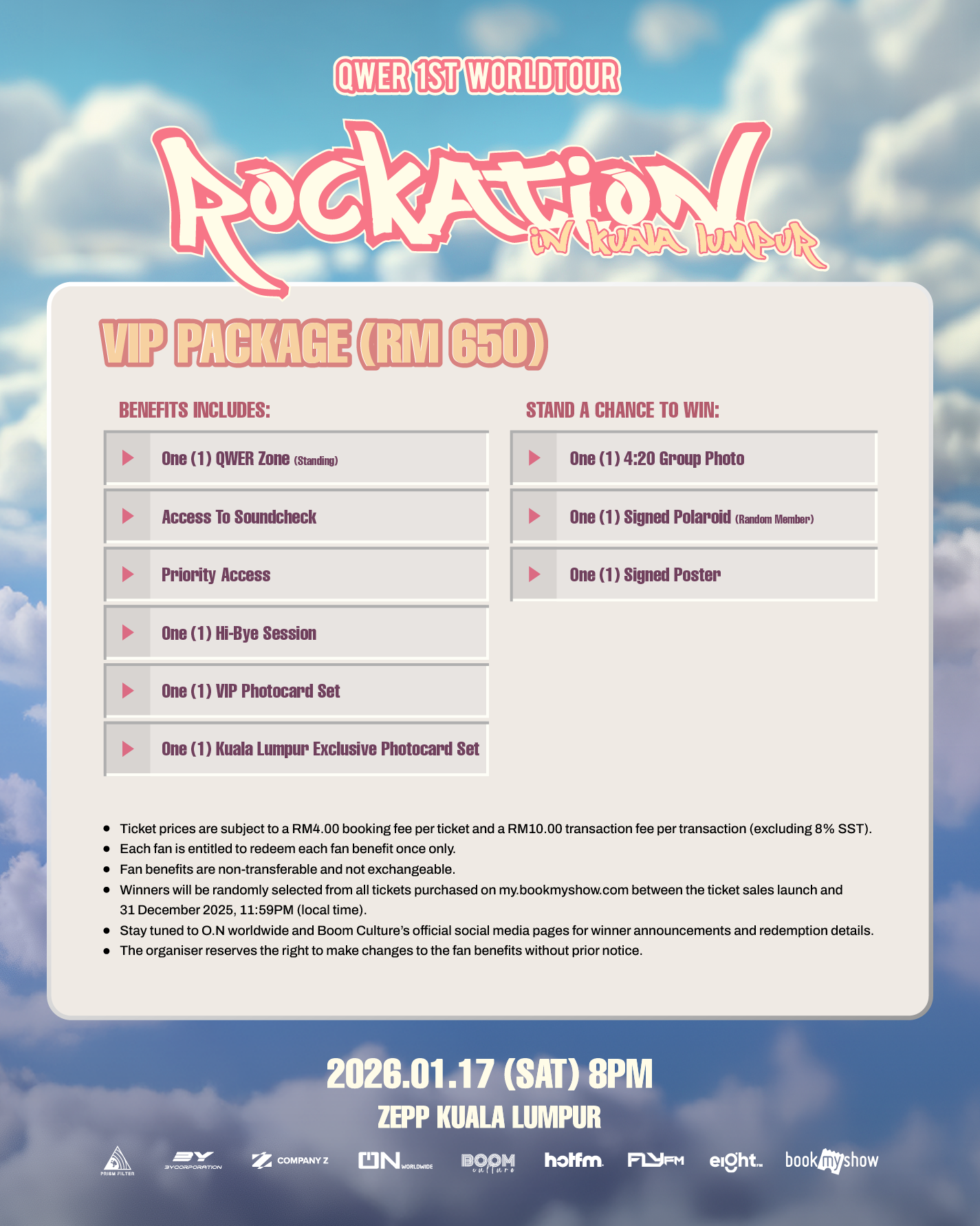 另外,主办方亦提供RM650的VIP套票,套票包含:1张 QWER Zone 门票、彩排福利、VIP限定照片卡一套、优先入场、Hi-Bye环节、吉隆坡限定照片卡一套,以及参与抽选团体合照、签名拍立得及签名海报的机会。有兴趣购票者,可以浏览 my.bookmyshow.com。