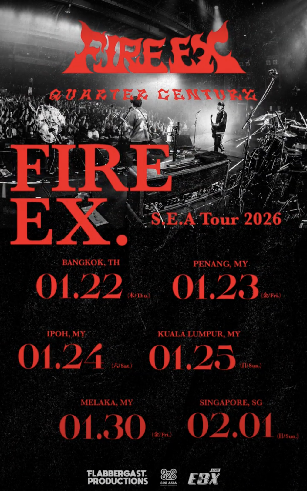 由 Flabbergast Productions 与 828 Asia 携手呈献 —— Fire EX.《Quarter Century》东南亚巡回演唱会2026马来西亚站的演出时长约90分钟,门票将于2025年11月25日(星期二),通过 https://peatix.com/ 开卖。