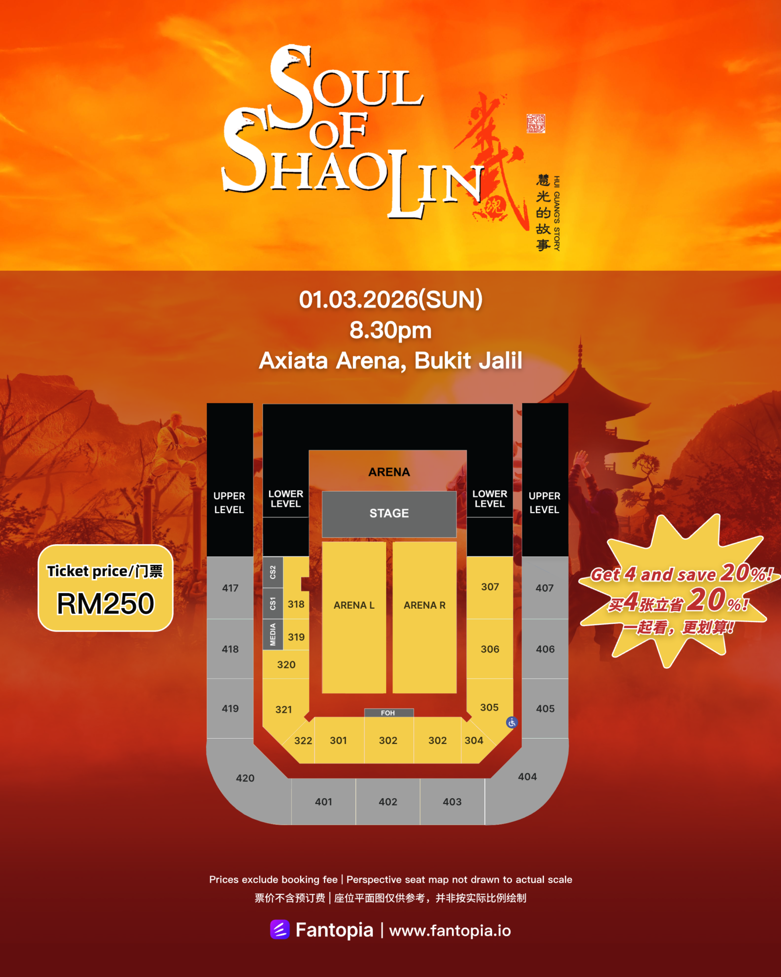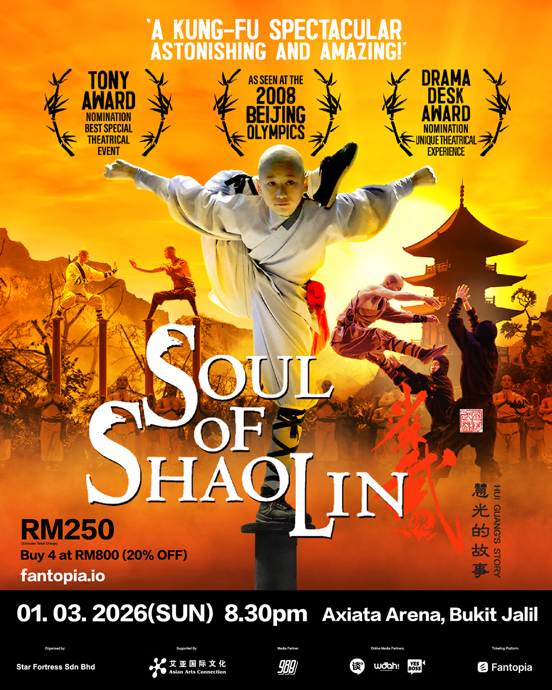 功夫剧《少林武魂·慧光的故事》 📅日期:2026年3月1日(星期日) ⏰时间:8.00PM 📍地点:Axiata Arena Bukit Jalil 🎫票价:RM250(*全场统一票价) 🔗票务网址:www.fantopia.io