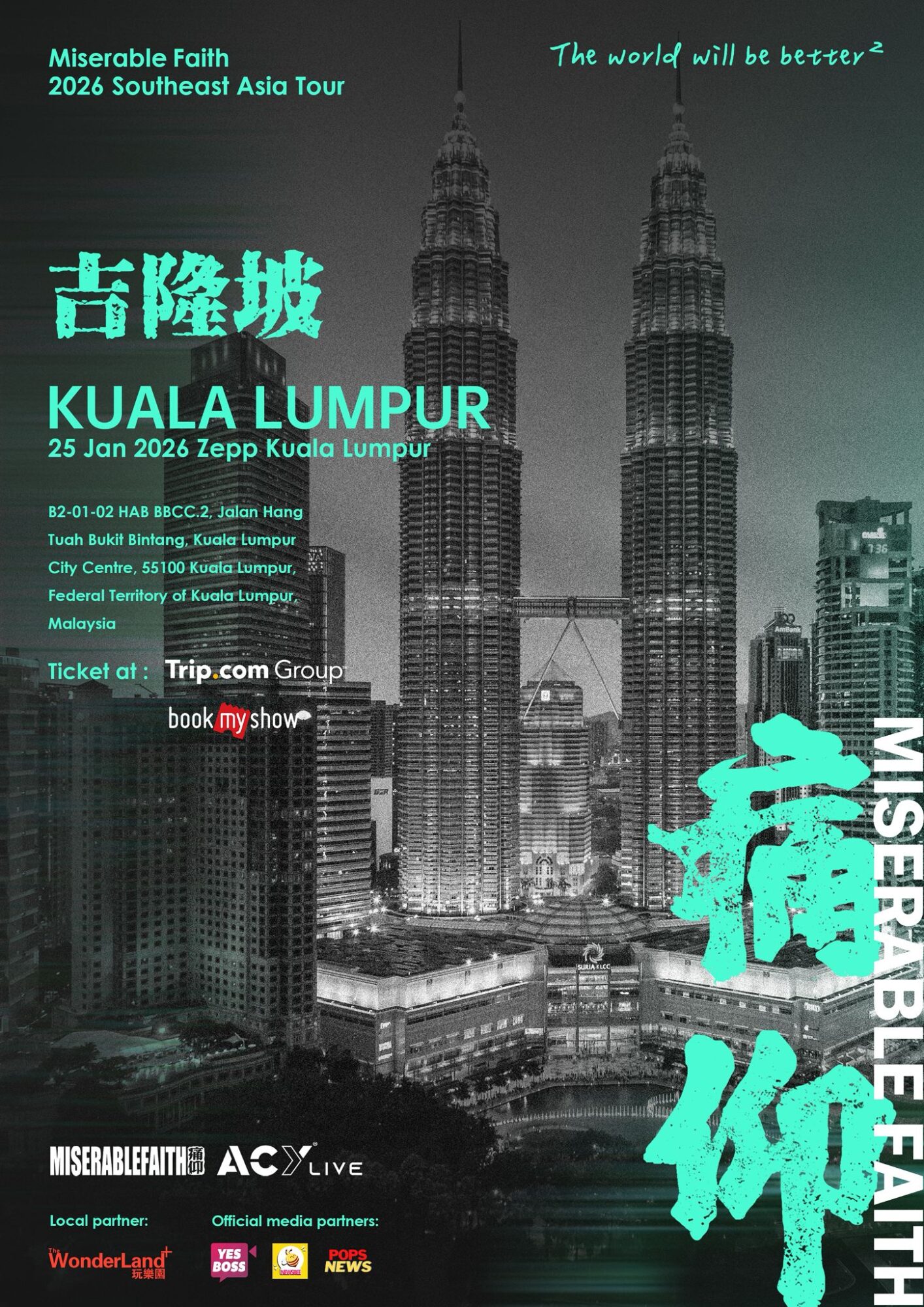 由痛仰乐队与ACYLIVE联办,The WonderLand Plus协办,YesBoss为网络媒体伙伴的《The World Will Be Better2》2026东南亚巡演-吉隆坡站,将于2026年1月25日(星期日),晚上7时在吉隆坡ZEPP举行。票价分为RM2888(VIP包厢,最多 8人)、RM288(优质座位区 或 站区)及RM268(预留座位区),所有票价不含RM4手续费。官方购票平台为 my.bookmyshow.com 与 Trip.com 。