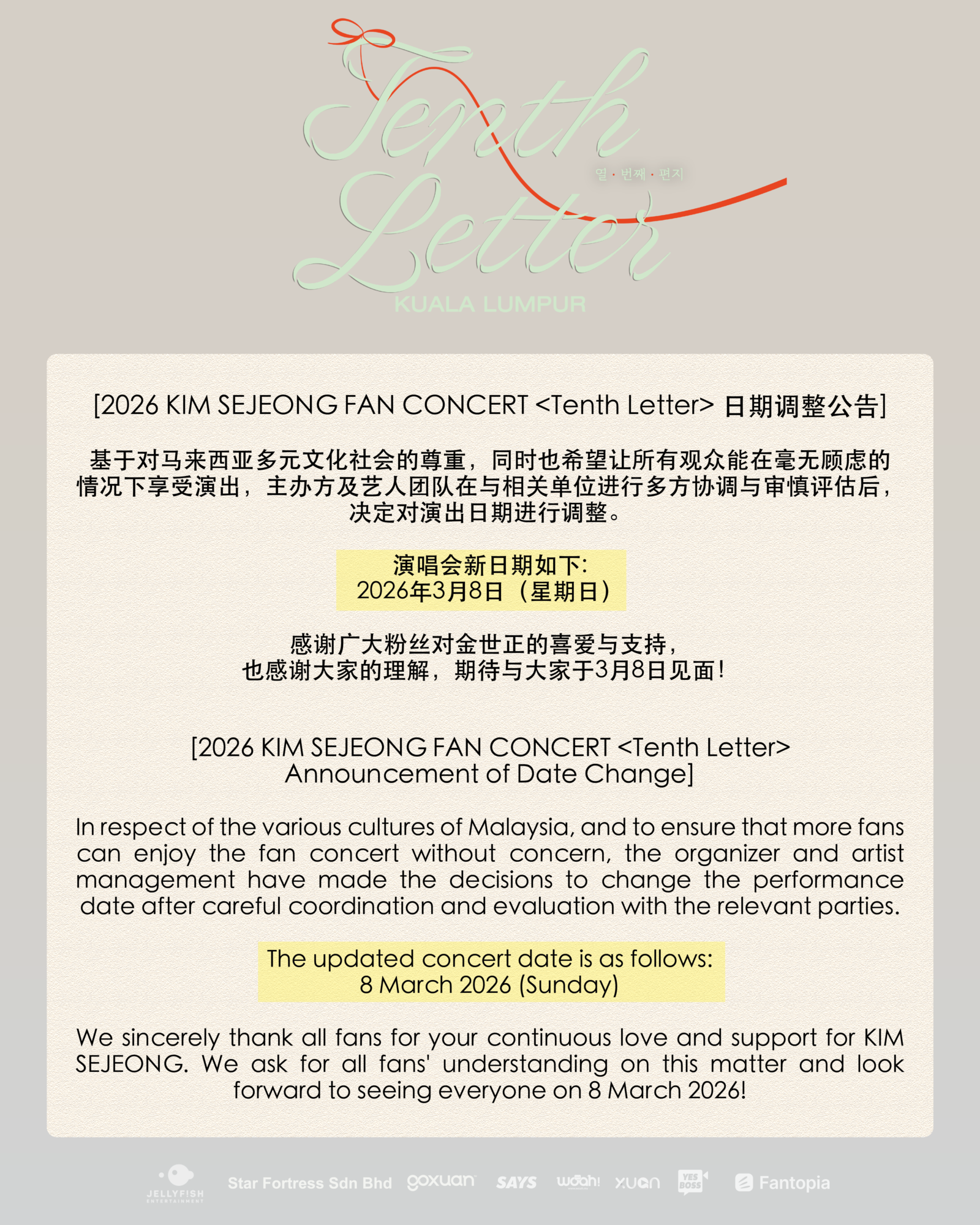 由Star Fortress主办,YesBoss为网络媒体伙伴,2026 KIM SEJEONG FAN CONCERT《Tenth Letter》TO KUALA LUMPUR 原定于2026年3⽉7⽇(星期六)举行,基于对马来西亚多元文化及宗教习俗的尊重,同时希望所有观众能在毫无顾虑的情况下享受演出,主办方及艺人团队在与相关单位进行多方协调与审慎评估后,决定对演出日期进行调整,改为 2026年3⽉8日(星期日),晚上8点在吉隆坡Mega Star Arena举⾏。