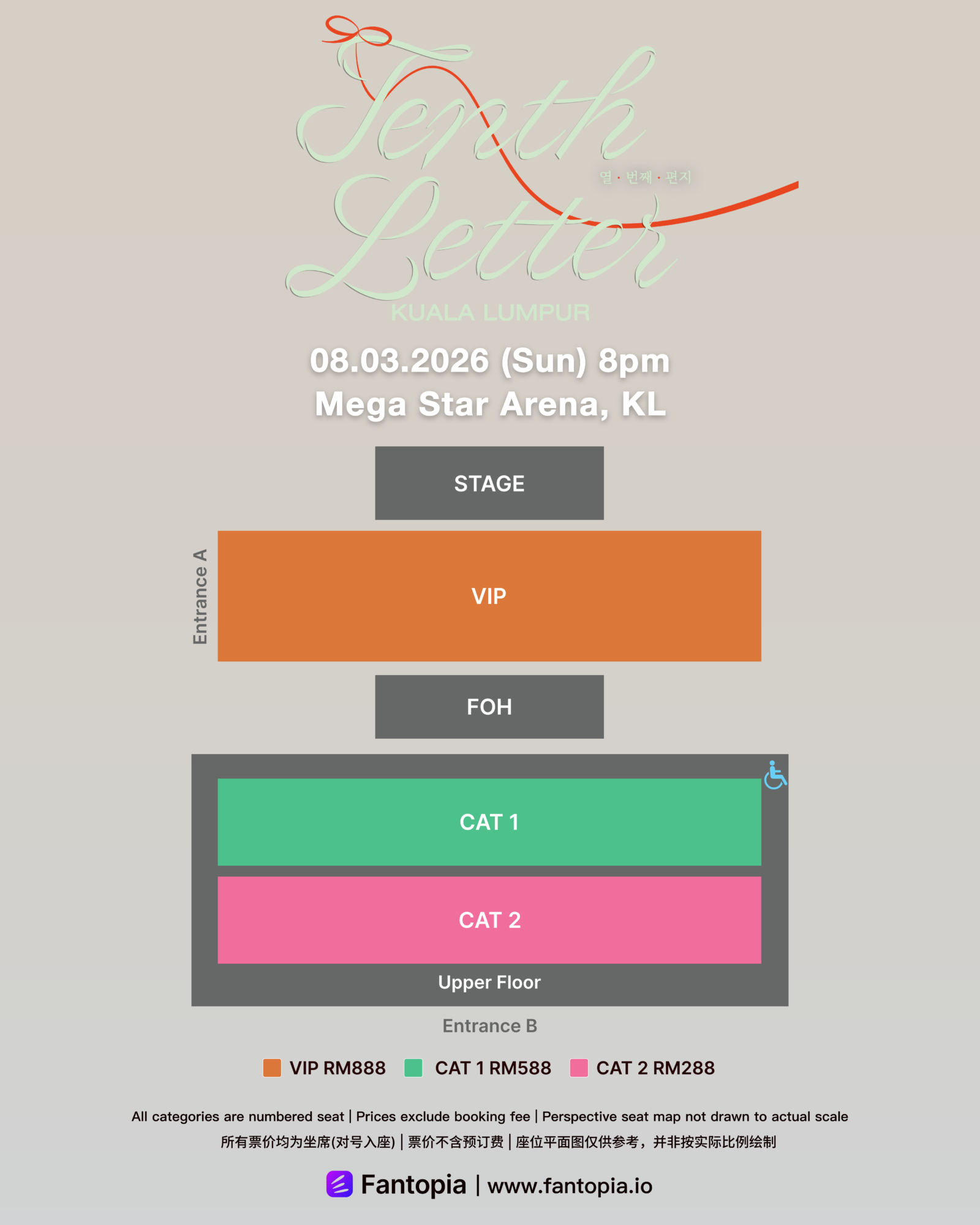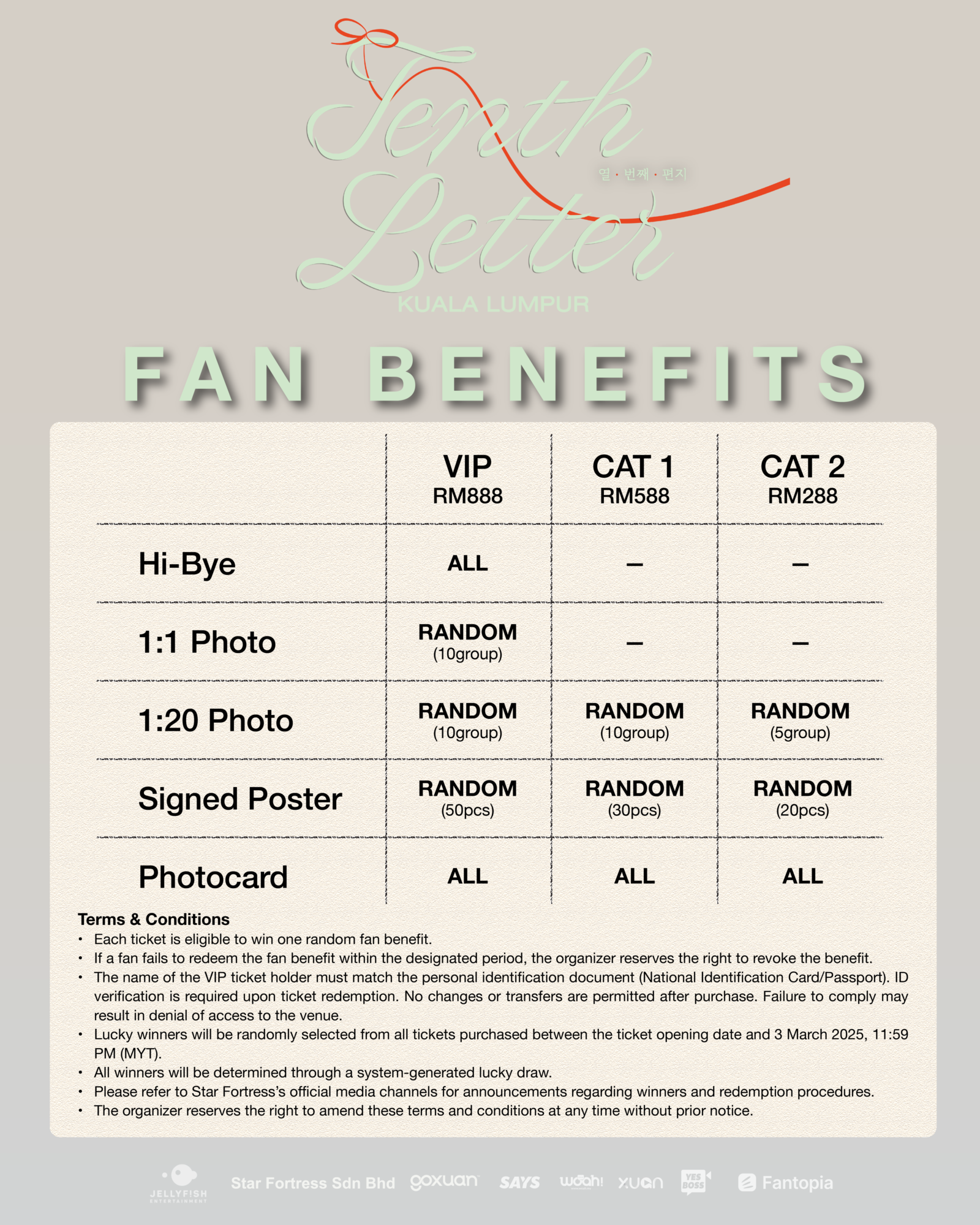 票价分为RM888(VIP)、RM588(CAT 1)以及RM288(CAT 2),所有门票均可参与粉丝福利抽选,有机会获得Hi-Bye问候、1:1 合照、1:20合照、签名海报或限定Photocard等不同福利。粉丝福利将以随机⽅式抽出,每张门票仅会享有对应⼀项福利。