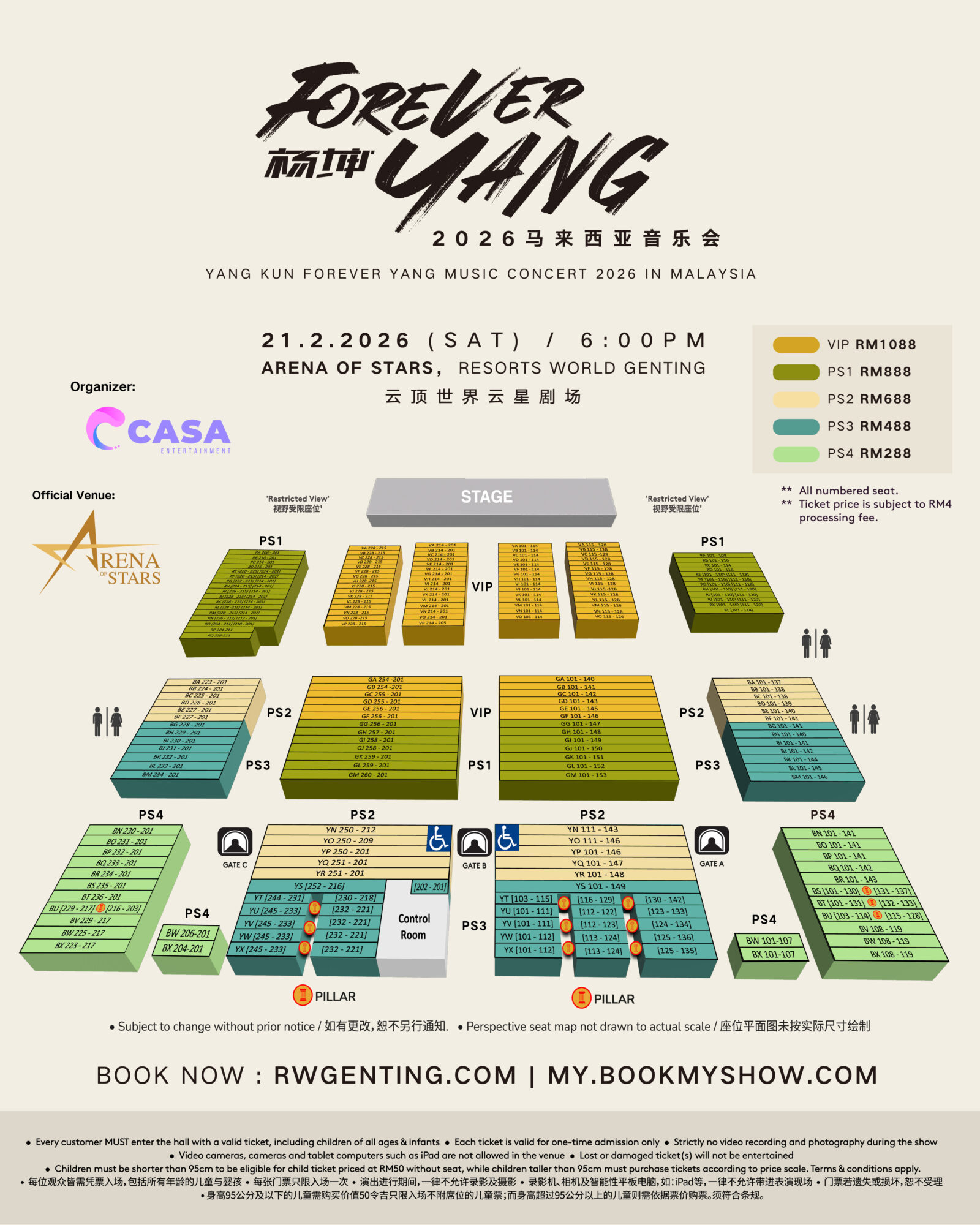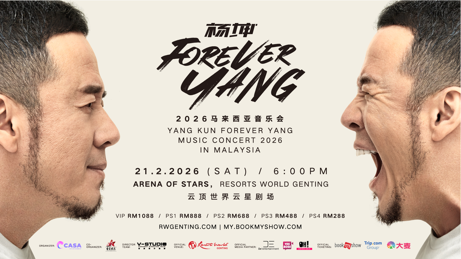 由Casa Entertainment Group主办,YesBoss为媒体伙伴,杨坤《FOREVER YANG》2026马来西亚音乐会将于2026年2月21日(星期六),傍晚6时在云顶世界云星剧场举行。票价分为RM1088(VIP)、RM888(PS1)、RM688(PS2)、RM488(PS3)和RM288(PS4)。