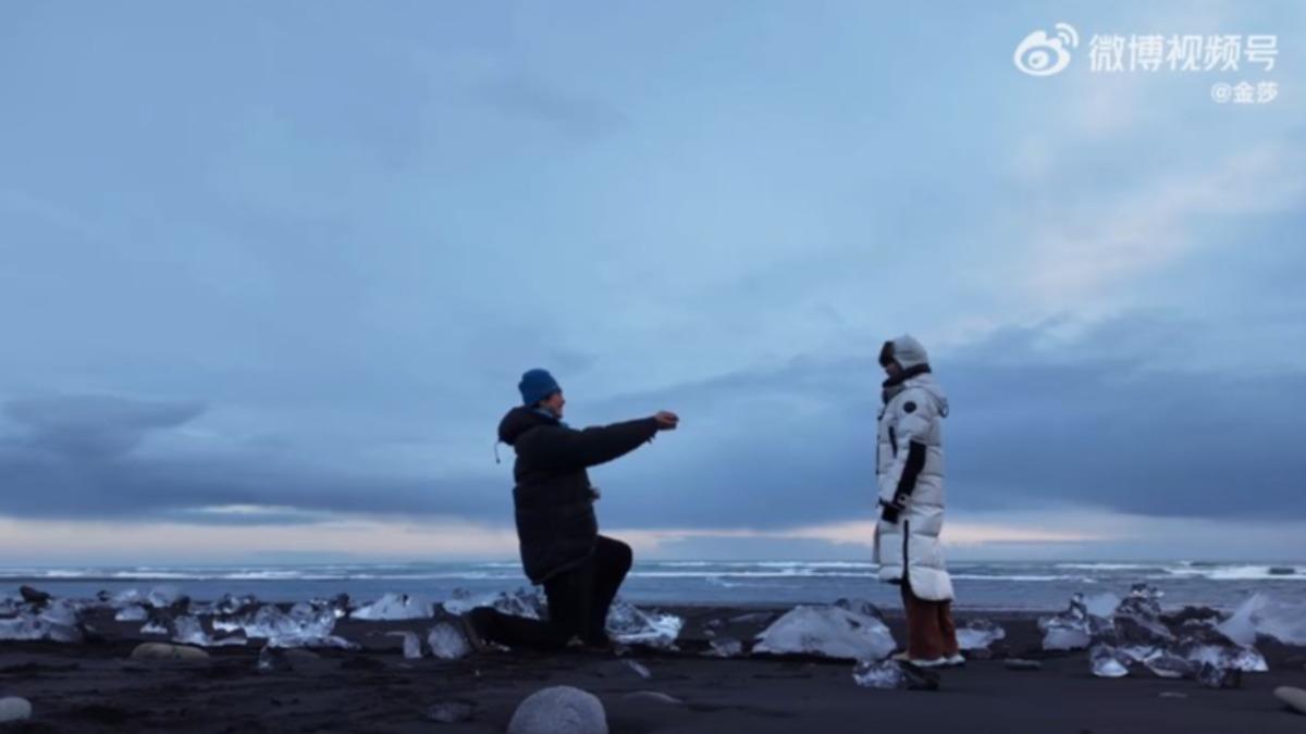 他们也上传了在冰岛的求婚影片,只见孙丞潇单膝下跪向金莎求婚,女方点头后,两人深情拥吻,现场气氛十分浪漫。
