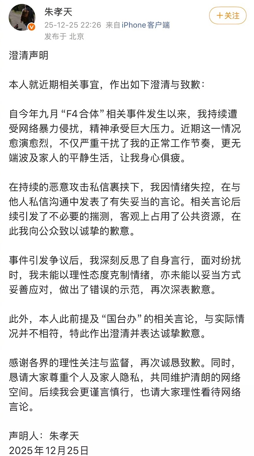 事件闹大后,朱孝天选在25日圣诞节夜晚发文道歉,并对近日风波做出澄清。他表示自从今年9月F4合体相关事件发生以来,持续遭受网络暴力侵扰,让他精神上承受巨大压力,不仅严重干扰到他的工作节奏,更无端波及家人的平静生活,导致他身心俱疲。