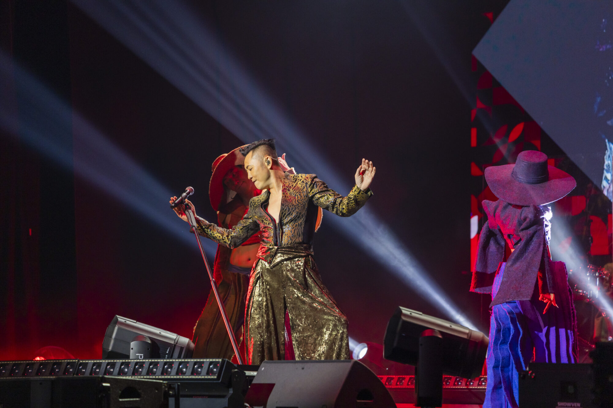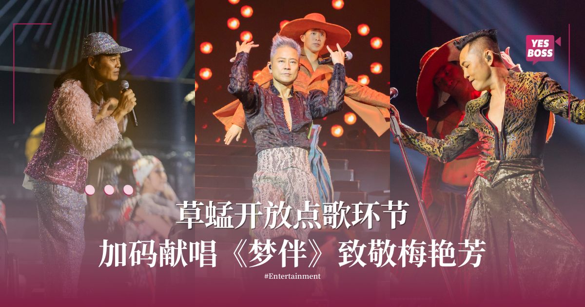 除了演唱《半点心》、《忘情森巴舞》、《宝贝对不起》等经典歌曲,草蜢还在安可时加码开放点歌环节,期间有歌迷点唱已故巨星梅艳芳的《将冰山劈开》,3人与乐队老师讨论后,决定改唱《梦伴》送给恩师,直呼:“没有梅艳芳就没有草蜢。”蔡一杰更感慨说:“阿姑(梅艳芳)在天上看着,大家一起唱一起跳吧。”