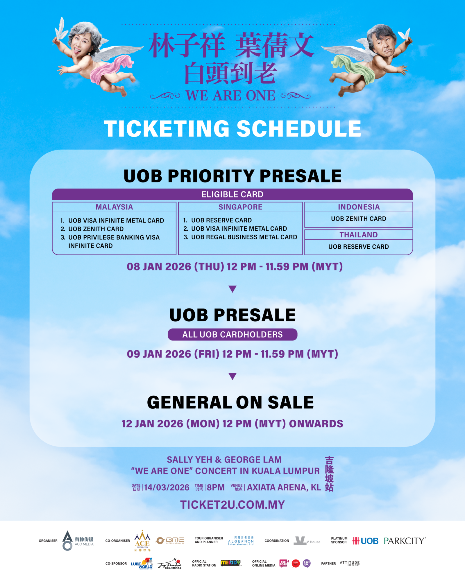 林子祥 x 葉蒨文《白頭到老 WE ARE ONE》世界巡迴演唱會 — 吉隆坡站将于 2026年1月12日(星期一),中午12点整于 ticket2u.com.my 正式开票!欲知更多详情,请关注 ACO MEDIA 有种传媒官方面子书 与 INSTAGRAM,以获取最新的消息。