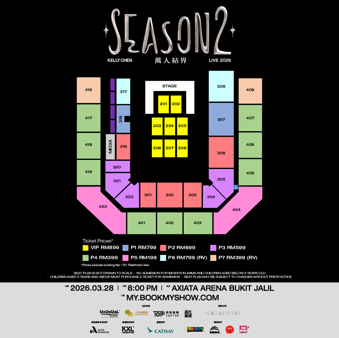 🎫票价:VIP RM899|P1 RM799|P2 RM699|P3 RM599|P4 RM399|P5 RM199