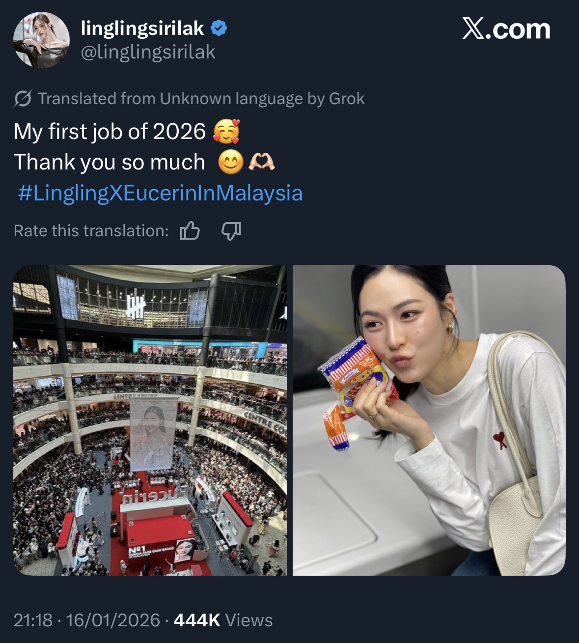 旋风来马不到24小时的邝玲玲,结束活动后便直奔机场,期间在X平台晒出商场挤满粉丝的照片,写下:“我在2026年的第一份工作,非常感谢你们。”