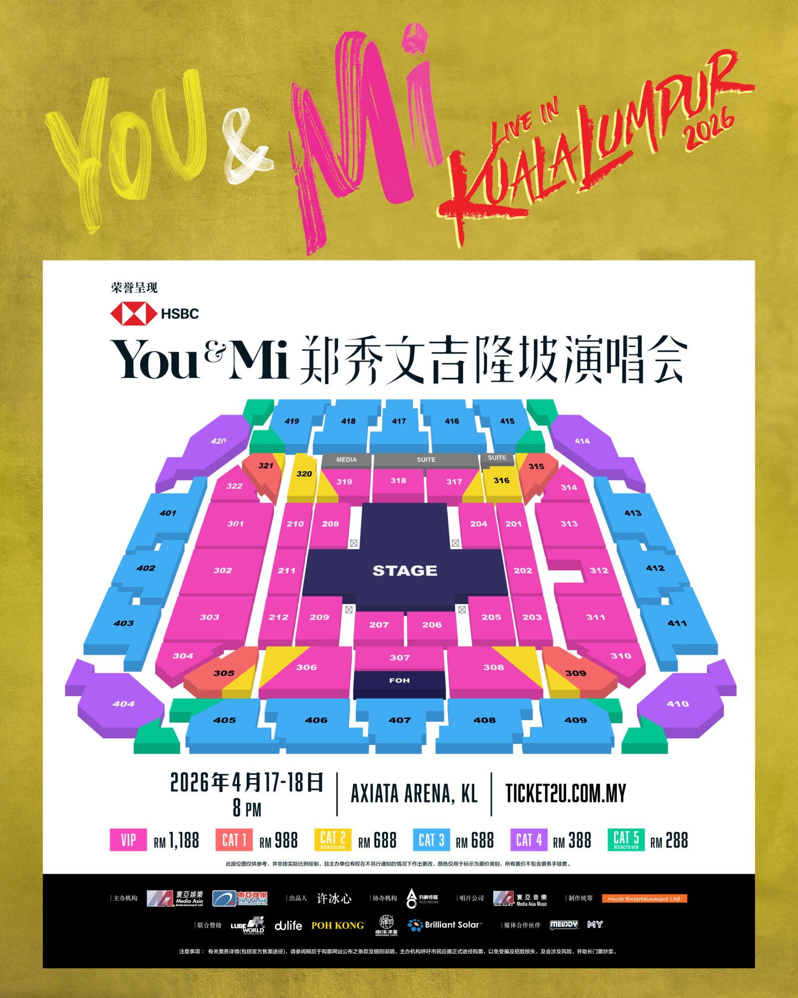 由 MEDIA ASIA 寰亚娱乐主办,ACO MEDIA 有种传媒协办,《You & Mi郑秀文吉隆坡演唱会2026》将于2026年4月17日及18日,晚上8点在吉隆坡 Axiata Arena Bukit Jalil 隆重开唱。