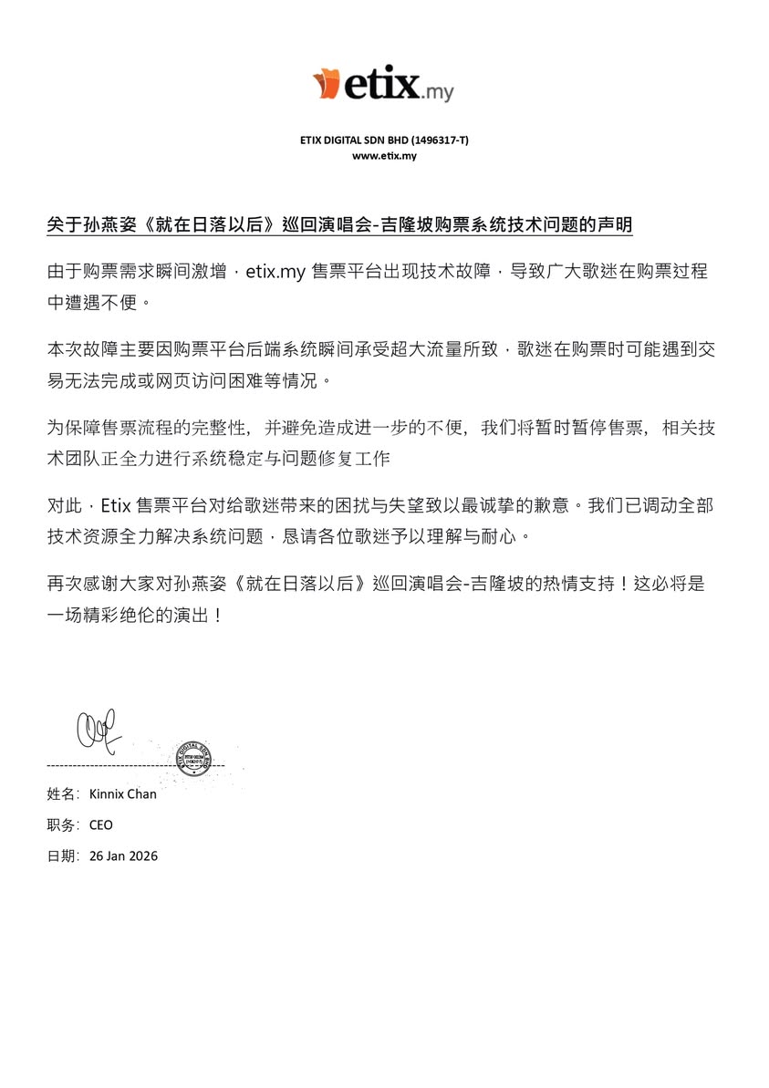 孙燕姿时隔12年重返大马开唱,《就在日落以后》巡回演唱会吉隆坡站门票今(26日)上午11时开卖后,涌进大票歌迷抢票。官方售票平台 etix.my 于下午4时29分发出声明,表示由于购票需求瞬间激增,导致平台出现技术故障,让许多歌迷在购票过程中遭遇不便,为确保售票流程的完整性,目前将暂停售票。