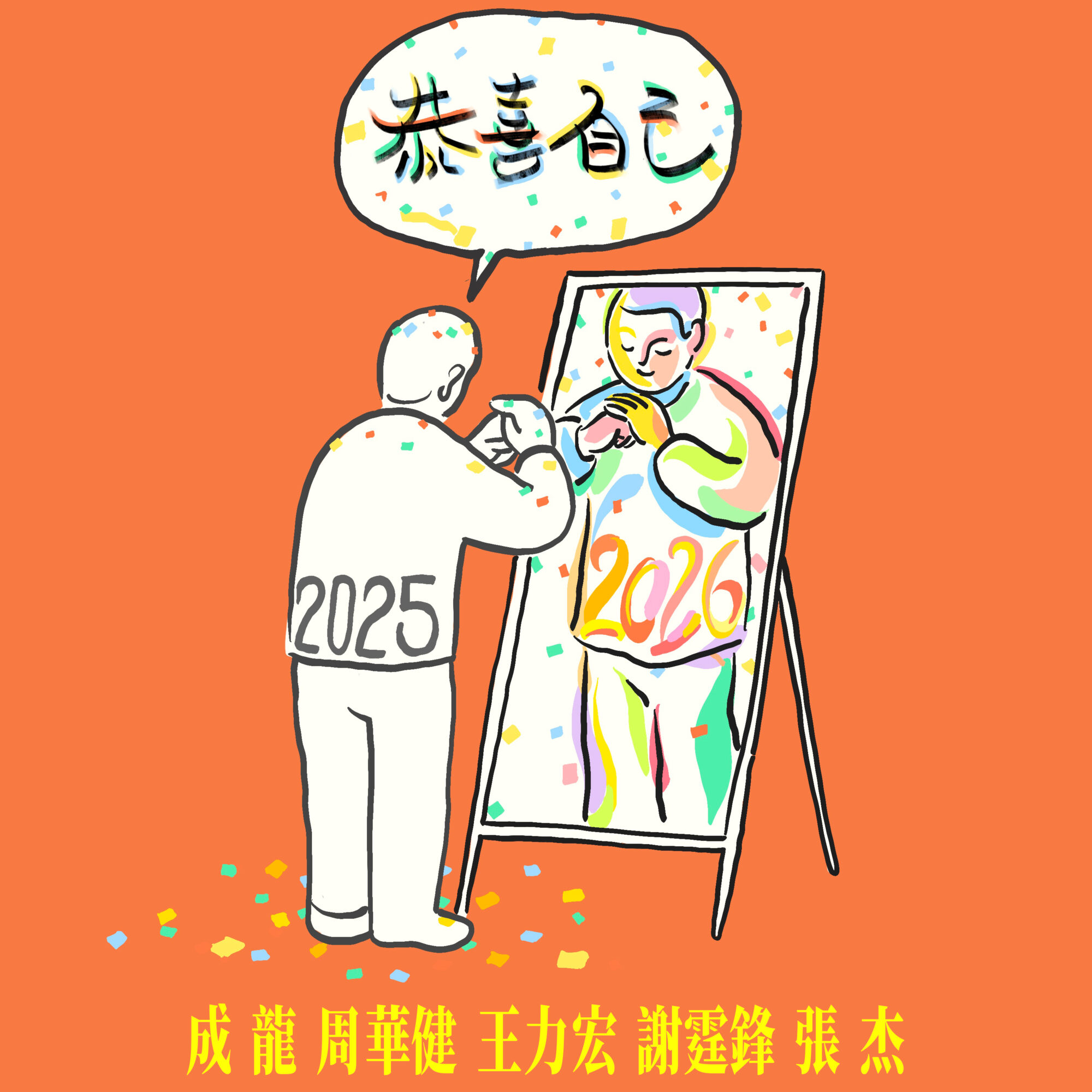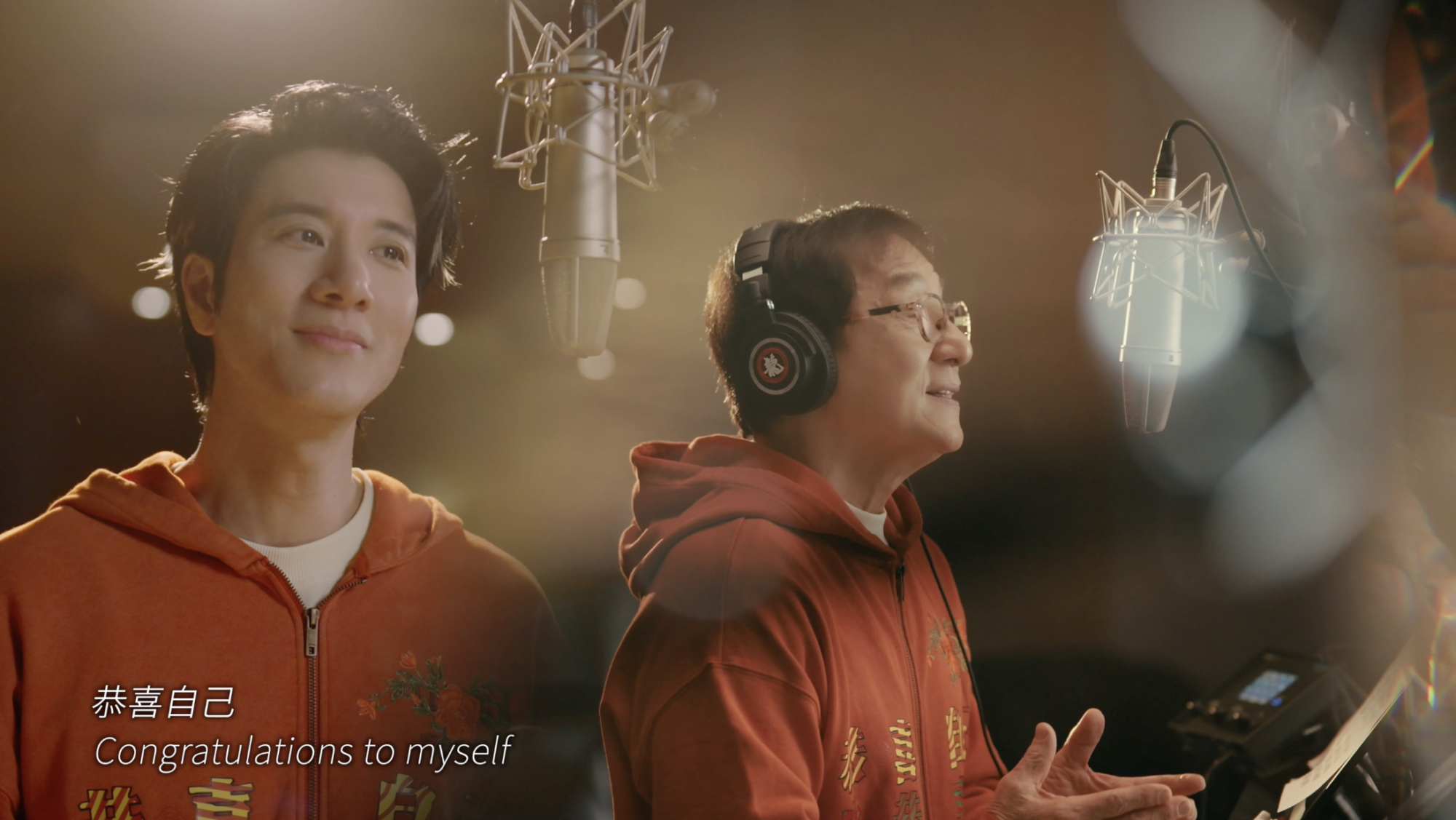 成龙大哥不仅与4位歌手事无巨细地沟通录制细节,也全程监制了《恭喜自己》音乐贺岁短片的拍摄制作过程。此外,这首歌的创意封面上,“恭喜自己”4个字由成龙大哥亲笔题写,希望这些细节上的用心,能给观众和听众朋友们带来小小的惊喜。