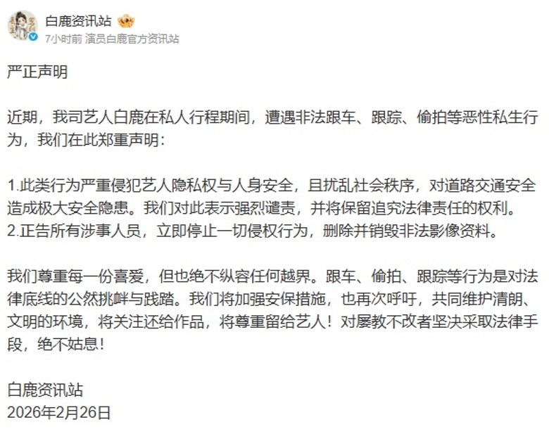 相关话题登上热搜后,网友纷纷痛批:“私生不是粉”、“跟车已经违法”、“请远离艺人私生活”。白鹿工作室事后发布声明,指白鹿在私人行程期间遭遇非法跟车、跟踪与偷拍,已严重侵犯隐私权与人身安全,并对道路交通安全构成重大隐患。