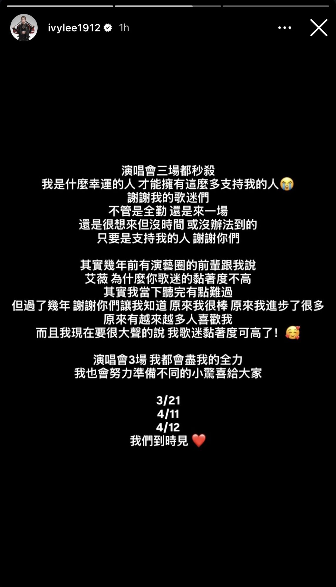 得知3场演唱会全数售罄后,她在IG限时动态激动写下:“我是什么幸运的人,才能拥有这么多支持我的人。”除了感谢每一位支持自己的歌迷,她也首度吐露心声,坦言多年前曾有演艺圈前辈对她说:“艾薇,为什么你歌迷的黏着度不高?”