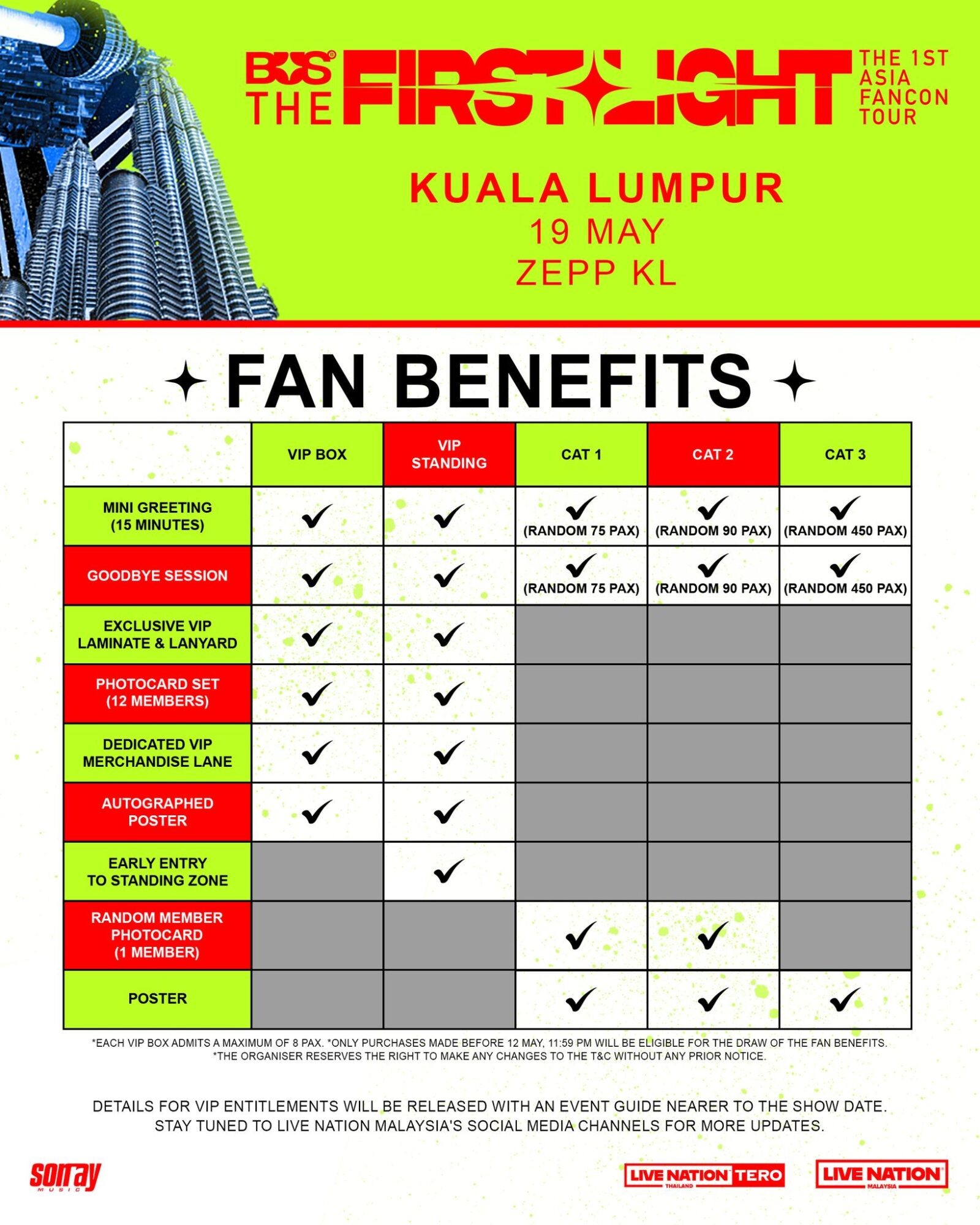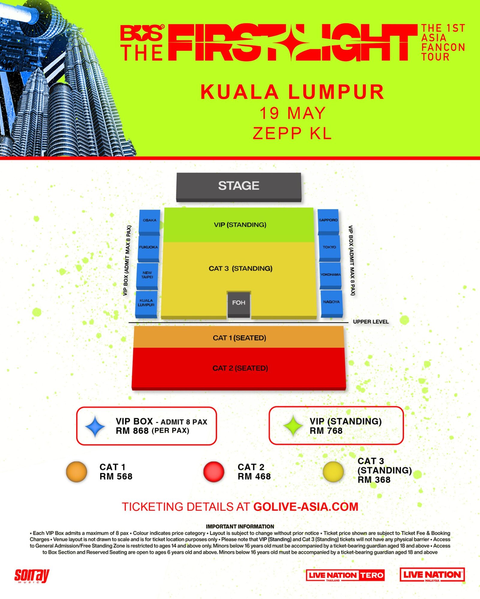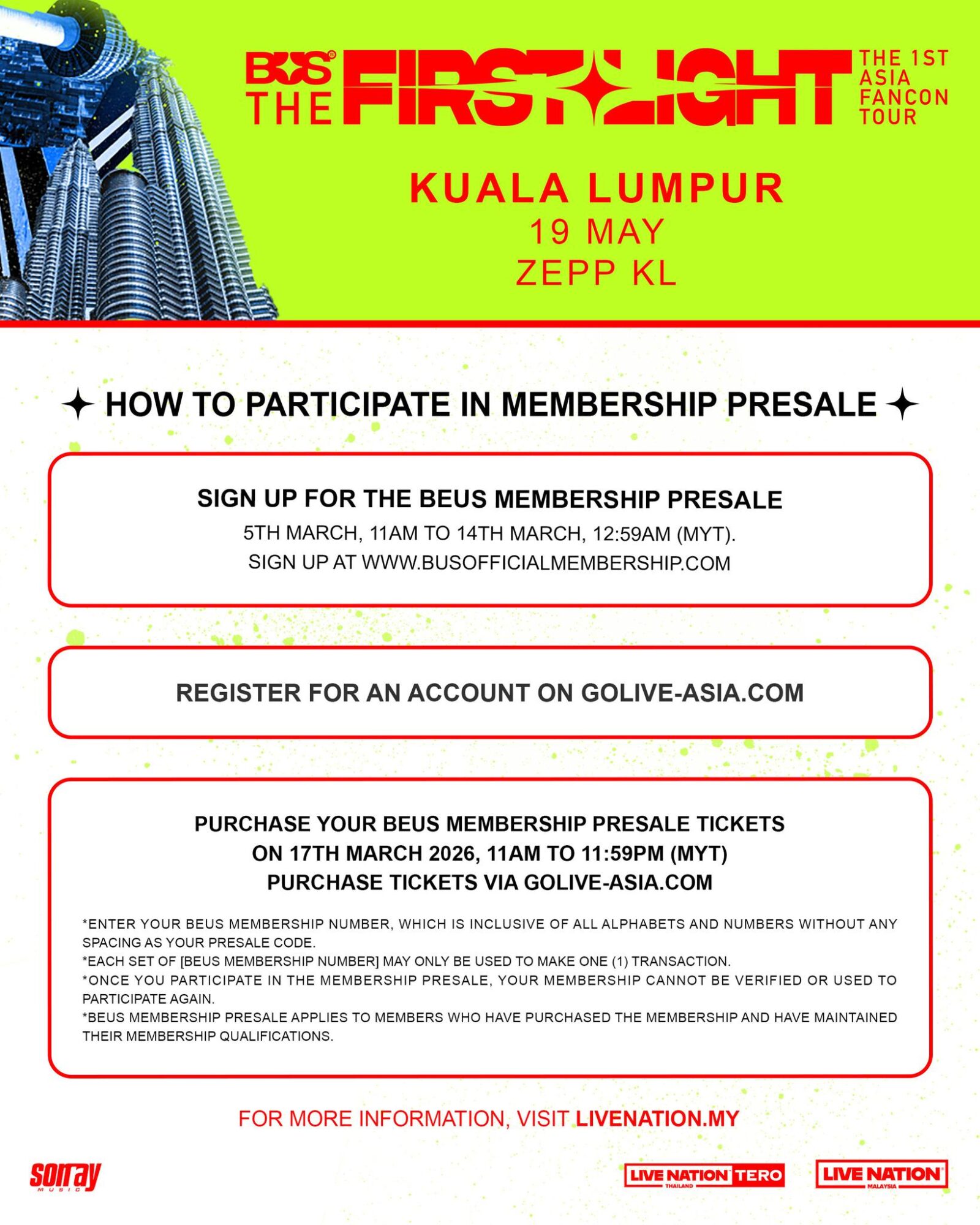 BUS首次亚洲巡演《THE FIRST LIGHT》吉隆坡站 📅日期:2026年5月19日(星期二) ⏰时间:8.00PM 📍地点:Zepp KL 🎫票价:VIP BOX RM868|VIP RM768|CAT1 1 RM568|CAT 2 RM468|CAT 3 RM368 🔗票务网址:www.golive-asia.com《BUS THE 1ST ASIA FANCON TOUR : THE FIRST LIGHT IN KUALA LUMPUR》座位图《BUS THE 1ST ASIA FANCON TOUR : THE FIRST LIGHT IN KUALA LUMPUR》粉丝福利《BUS THE 1ST ASIA FANCON TOUR : THE FIRST LIGHT IN KUALA LUMPUR》预售时间