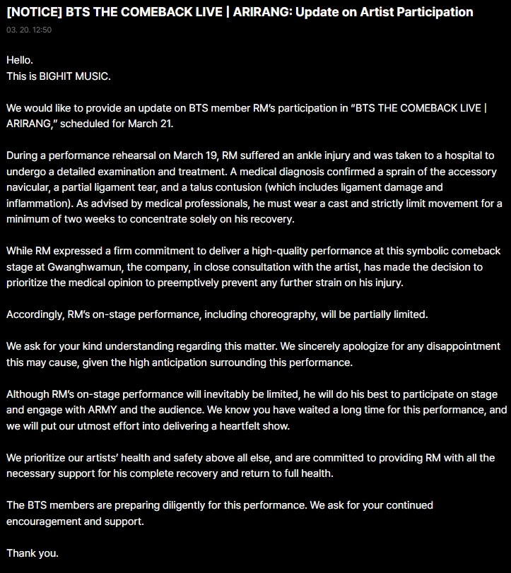 BTS所属经纪公司BIGHIT MUSIC稍早发出声明,透露RM在19日的彩排过程中,脚踝不慎受伤,紧急送医接受详细检查与治疗后,被诊断出副舟状骨扭伤、部分韧带撕裂,以及距骨挫伤(包含韧带损伤与发炎)。医生建议RM打石膏固定脚部,且至少在2周内把活动量降至最低,专心休养。