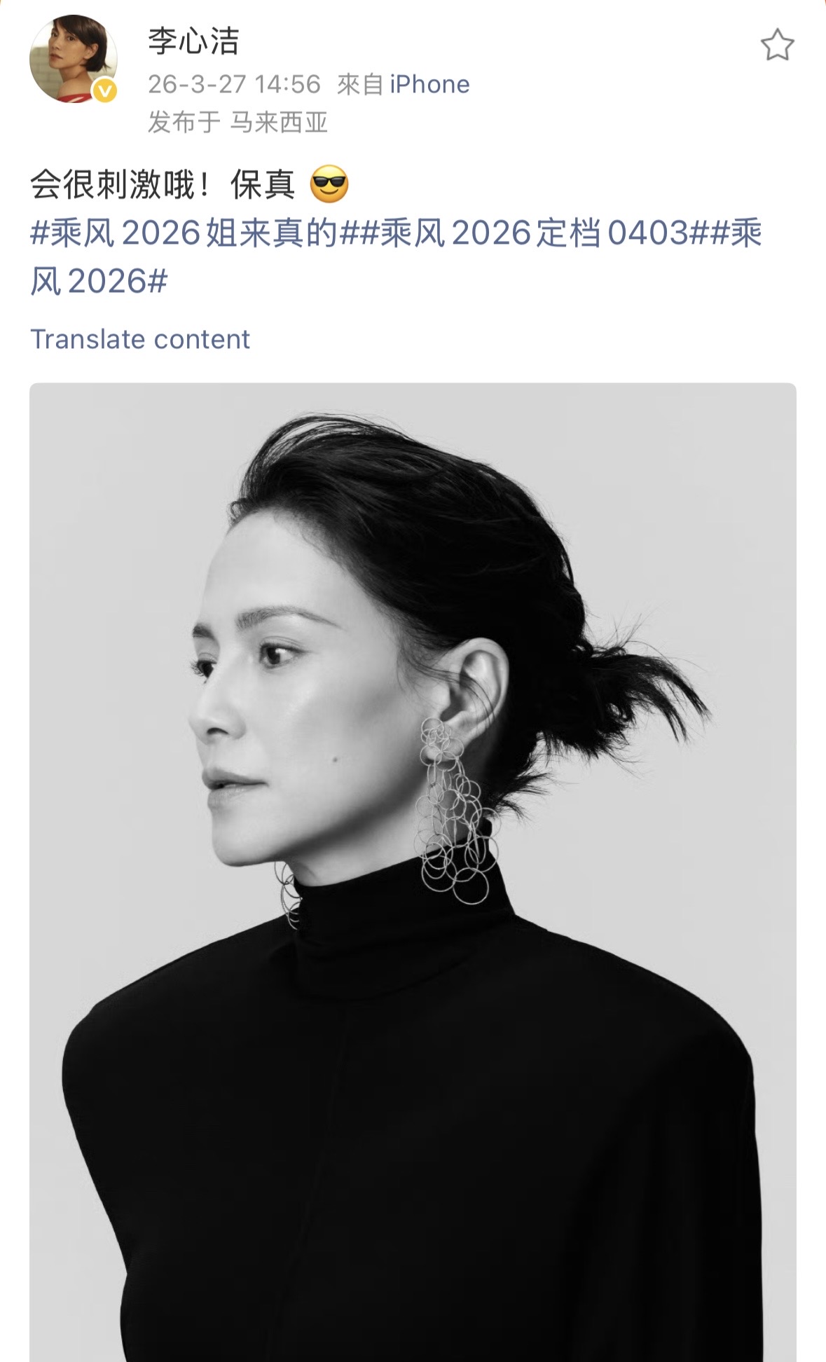 中国综艺节目《乘风2026》(《乘风破浪的姐姐》第七季)33位姐姐的完整名单曝光!50岁金马影后李心洁确定代表马来西亚出战,她透过微博发文表示:“会很刺激哦!保真。”