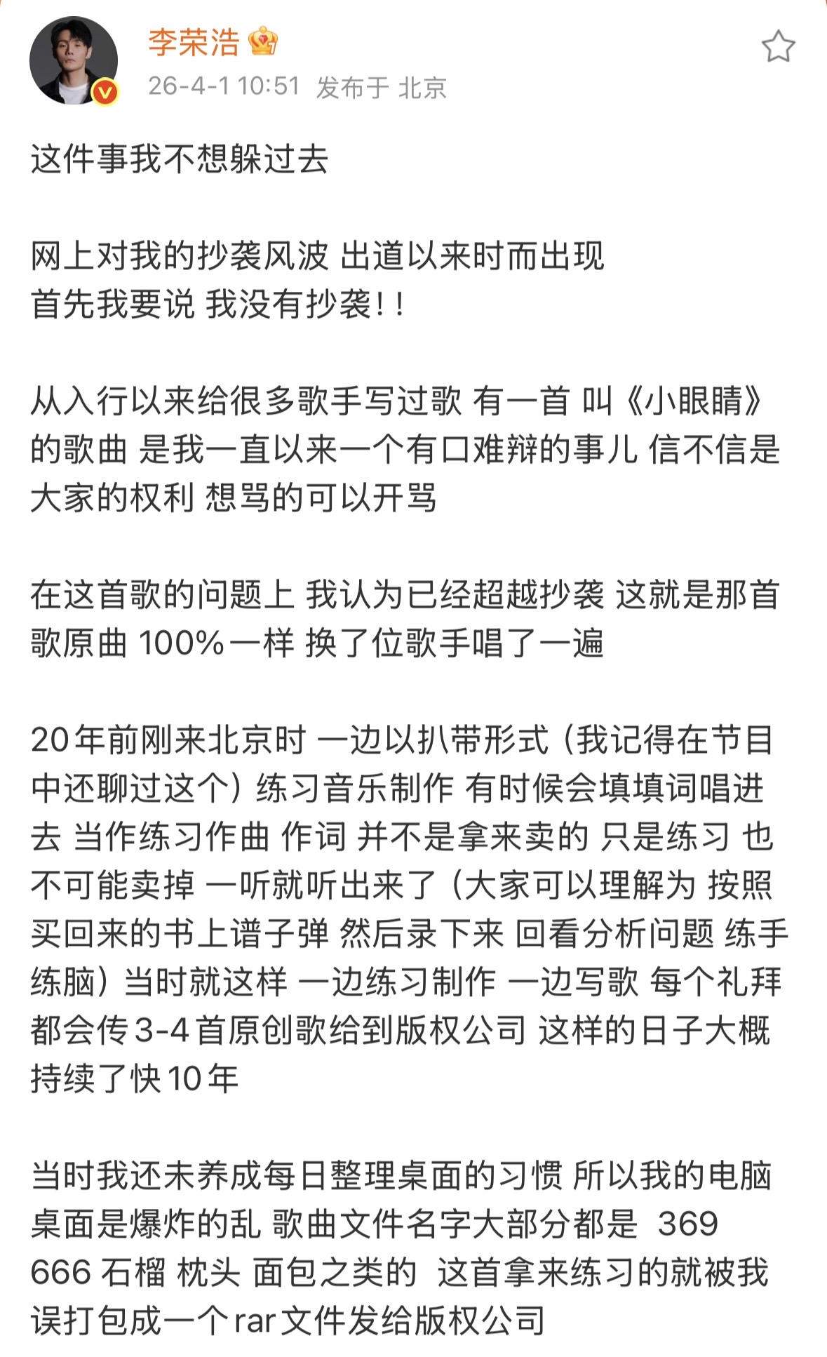 对此,李荣浩今(1日)正面回击,强调:“我没有抄袭!”他在长文中解释来龙去脉,称《小眼睛》是20年前刚到北京时的练习音乐制作和创作的音档,但当初这些音档文件都被他随便放置在电脑里,并未妥善分类管理,导致误将翻唱练手的版本发给版权公司。