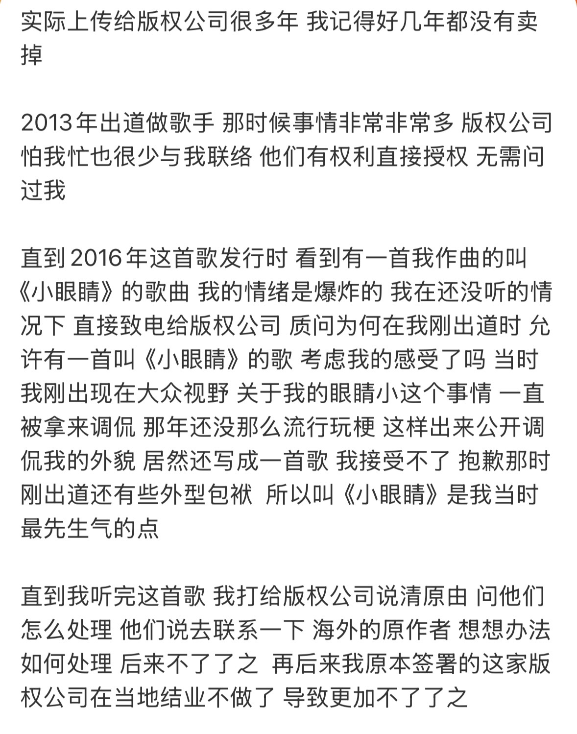 由于版权公司可直接授权使用他的作品,因此他直到2016年正式发行时才知情。他透露当下情绪是“爆炸的”,“当时我刚出现在大众视野,关于我的眼睛小这个事情,一直被拿来调侃,那年还没那么流行玩梗,这样出来公开调侃我的外貌,居然还写成一首歌,我接受不了。抱歉那时刚出道还有些外型包袱,所以叫《小眼睛》是我当时最先生气的点 。”