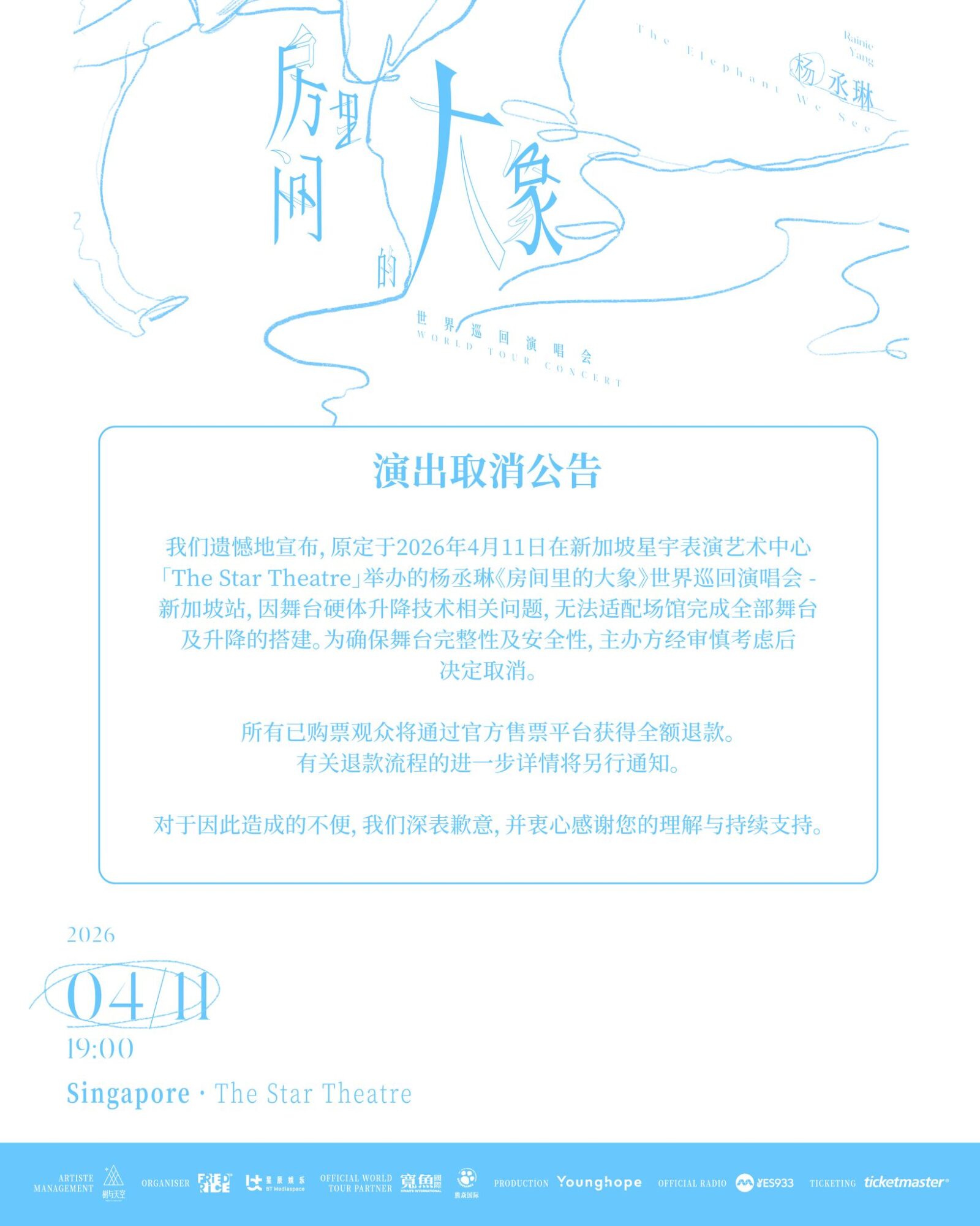 娱乐星闻 杨丞琳新加坡演唱会二度取消 主办:舞台硬体升降技术问题 杨丞琳新加坡演唱会在开演前一周突然宣布取消! Published 2 hours ago on April 4, 2026 By 编辑部 台湾歌手杨丞琳原定于下周六(3月11日)在新加坡The Star Theatre举办《房间里的大象》世界巡回演唱会,不料开演前一周无预警宣布取消。 新加坡演唱会主办方之一FriedRice Entertainment于3日晚发布公告,写下:“因舞台硬体升降技术相关问题,无法适配场馆完成全部舞台及升降的搭建。为确保舞台完整性及安全性,主办方经审慎考虑后决定取消。所有已购票观众将通过官方售票平台获得全额退款。” 事实上,这已是杨丞琳在新加坡的演唱会第二次遭遇取消。此前,她原定2024年8月24日在新加坡室内体育馆举办《Like A Star》世界巡回演唱会,但在演出前两周,当时的主办方星辰娱乐(BT Mediaspace)以“不可抗力因素,短时间内无法妥善解决”为由宣布取消,而此次的《房间里的大象》巡演,星辰娱乐同样也是主办方之一,再度引发关注与讨论。 新闻采访或合作邀约,可电邮至 [email protected] Advertisement Related Topics:Featured新加坡演唱会杨丞琳演唱会 Don't Miss Mark结束10年约宣布退团 NCT Dream演唱会泪崩早预告? 编辑部 新闻采访或合作邀约,可电邮至 [email protected] Continue Reading Advertisement Yes Boss You may like YesBoss好康丨《2026 CNBLUE LIVE ‘3LOGY’IN KUALA LUMPUR》演唱会门票 陶大宇、莫家淦、姚子羚、陈晓华 6月27日来马献唱送暖 LiSA 607大马演唱会票价释出 网惊:票本来就少还不贵 颜人中6月6日新加坡开唱 票价、粉丝福利、开票时间一次看 YesBoss好康丨许冠杰《最喜欢你》云顶世界演唱会2026门票 IU藏头诗剧透演唱会 经纪公司证实9月开唱 Click to comment Leave a Reply Cancel replyYour email address will not be published. Required fields are marked *Comment Name * Email * Website Save my name, email, and website in this browser for the next time I comment.