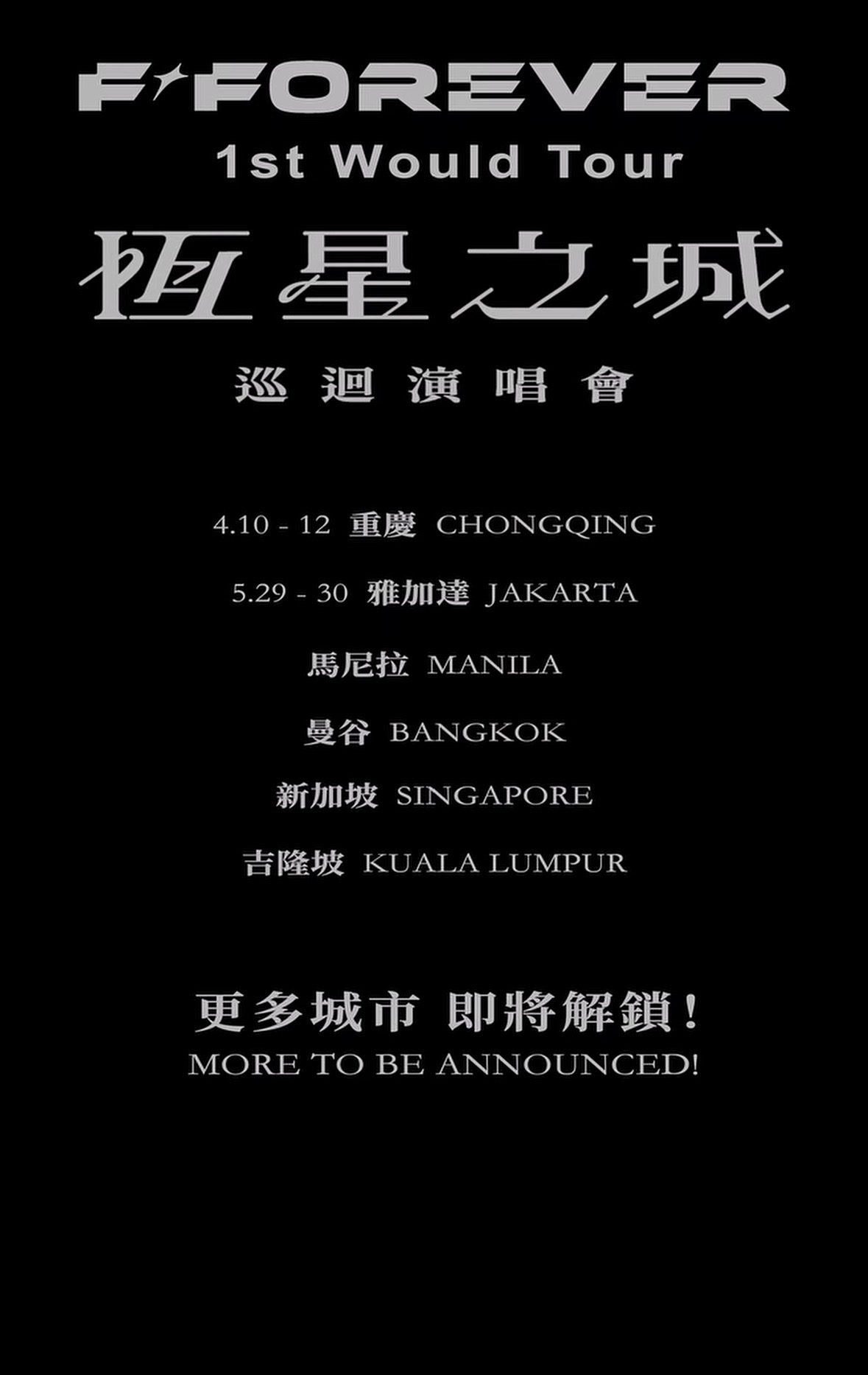 影片尾声更惊喜曝光《F✦FOREVER恒星之城世界巡回演唱会》的其他场次,除了已官宣的重庆和雅加达站,接下来还将登陆马尼拉、曼谷、新加坡以及吉隆坡等城市。