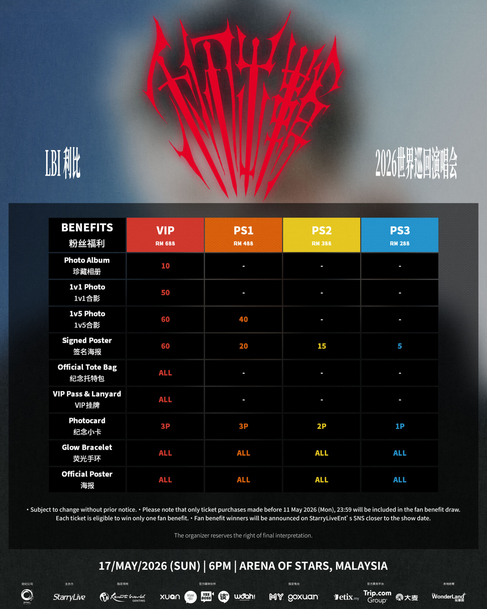 《LBI利比[利刃出鞘]2026世界巡回演唱会–马来西亚站》门票价格分别为RM688(VIP)、RM488(PS1)、RM388(PS2)及RM288(PS3),所有票价未含手续费。此外,粉丝还有机会享有以下福利: