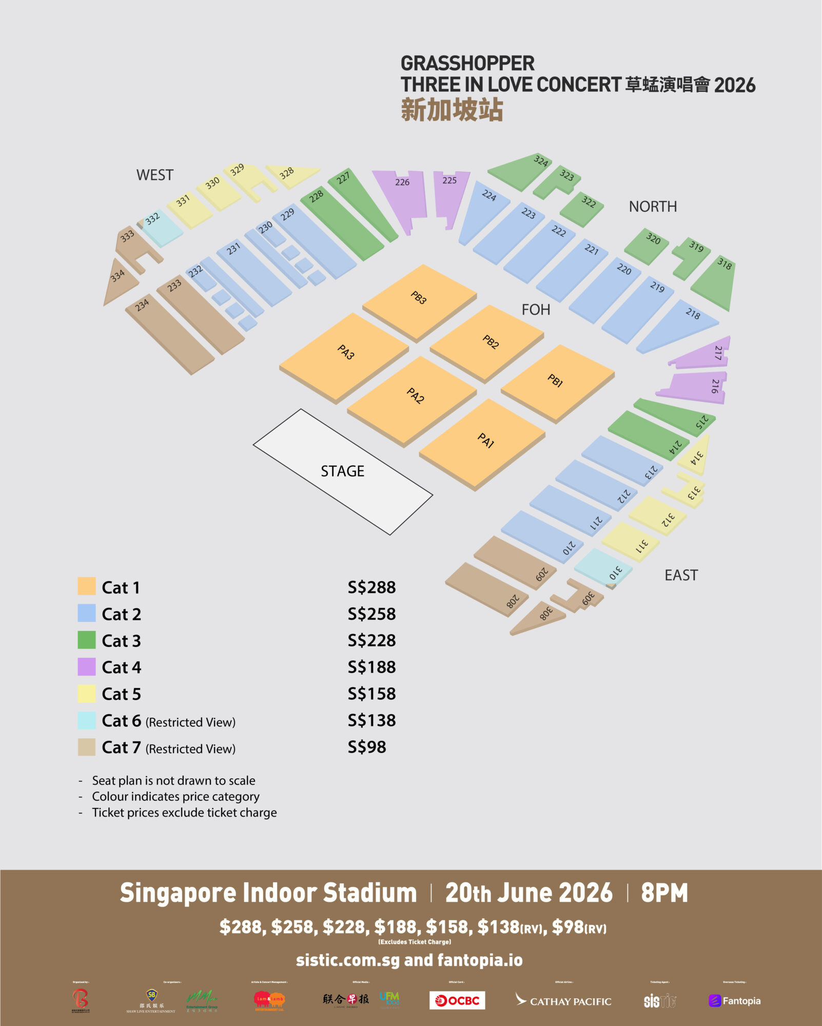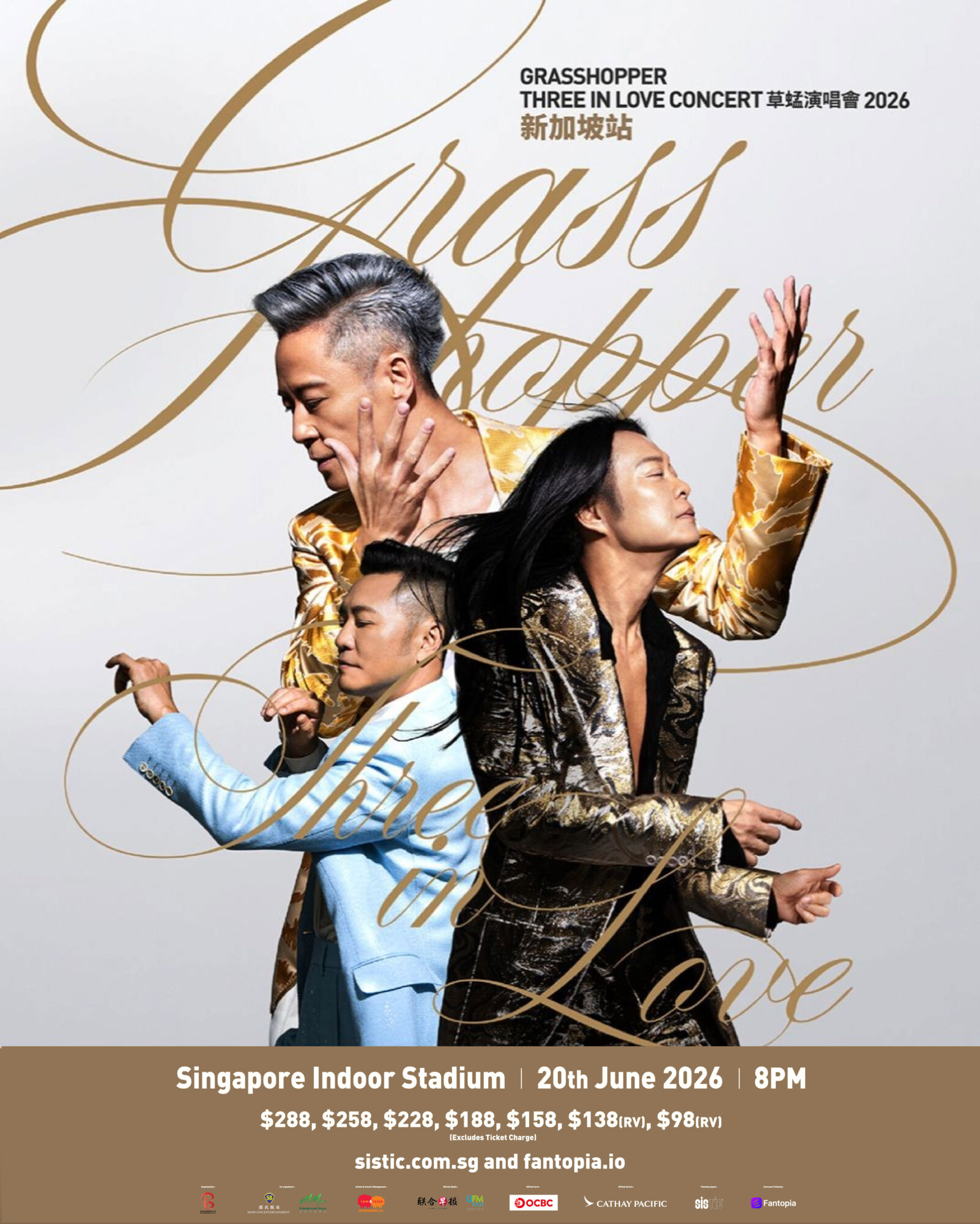《GRASSHOPPER THREE IN LOVE CONCERT草蜢演唱会2026》- 新加坡站 📅日期:2026年6月20日(星期六) ⏰时间:8.00PM 📍地点:新加坡室内体育馆 🎫票价:$288|$258|$228|$188|$158|$138(RV)|$98(RV) 🔗票务网址:sistic.com.sg|fantopia.io