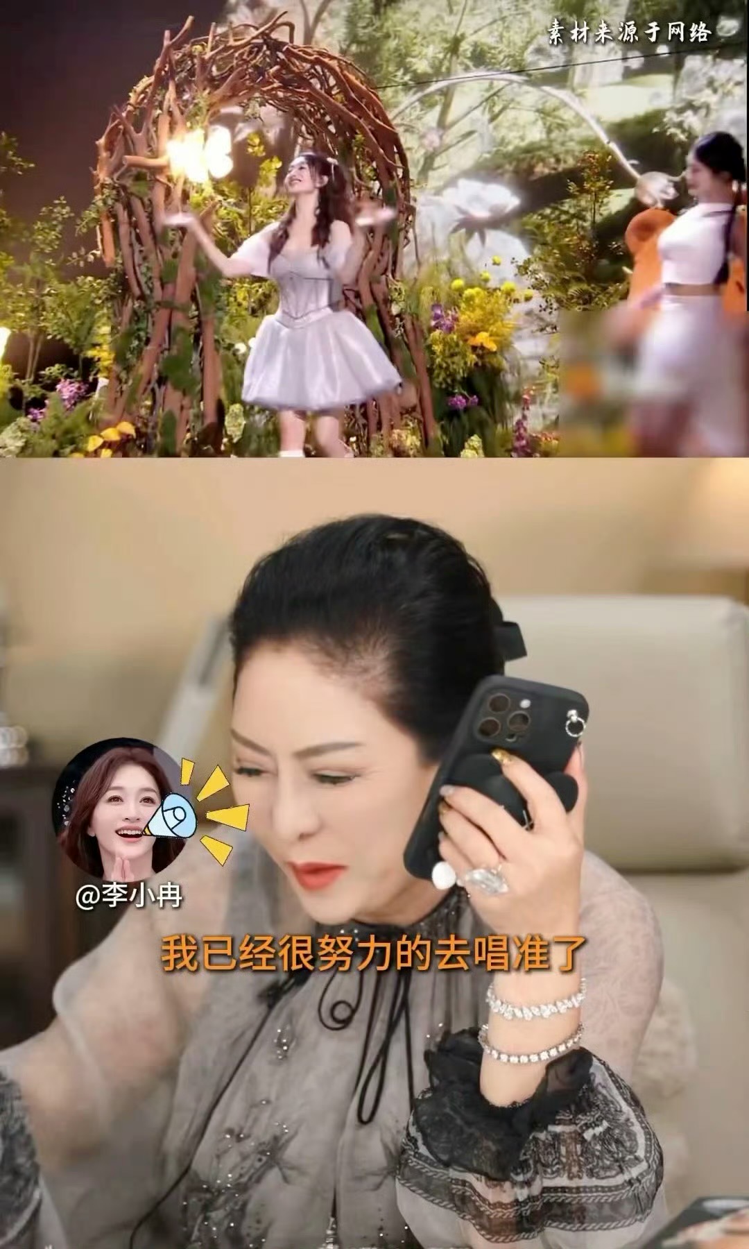 李小冉先前透过实境节目《一路繁花》与向太(陈岚)相识,因此向太日前也在直播中与她通话,关心她参赛的心情。李小冉首先坦承,她为了唱歌走音的事懊恼并哭了2个晚上,“我不知道我唱歌那么难听,我去卡拉OK里唱的还行,为什么戴上那个(耳返),一上台我就不行了,我已经很努力地去唱准了,第一声开口就崩了”。