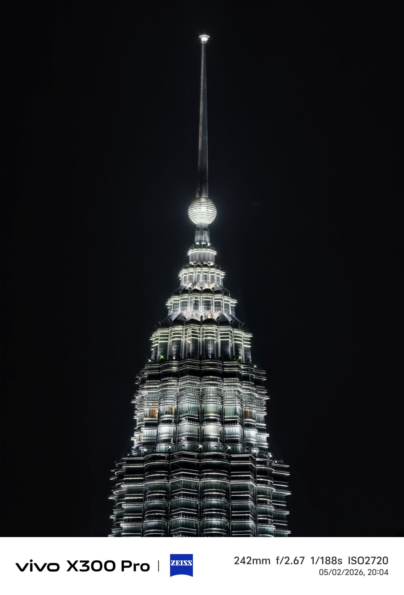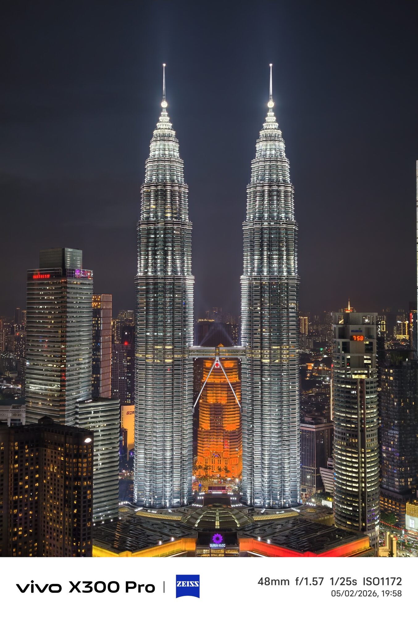 vivo X300 Pro 在这种高反差环境下展现出成熟的动态范围控制能力。KLCC的钢结构线条依然清晰可见,没有被灯光冲成一片白光。塔身灯光层次分明,城市楼宇的窗灯也清楚可辨,画面整体亮度自然不过曝。