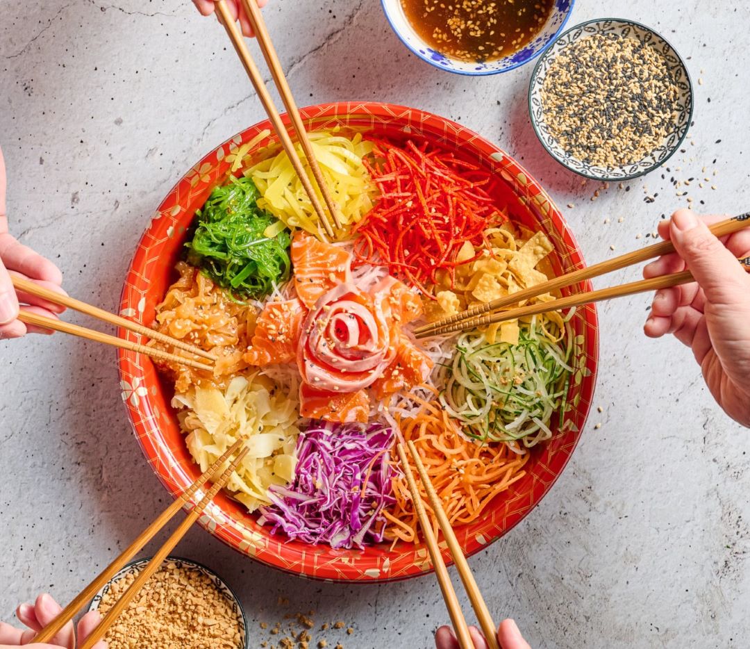 又称“七彩鱼生”,寓意风生水起。它是由生鱼片、腌姜丝、彩色蔬菜丝、花生碎和酸甜酱等多种食材组成。虽然传统上是在大年初七“人日”食用,但现在从收工宴到元宵节,捞生都必定会出现在聚餐中。
