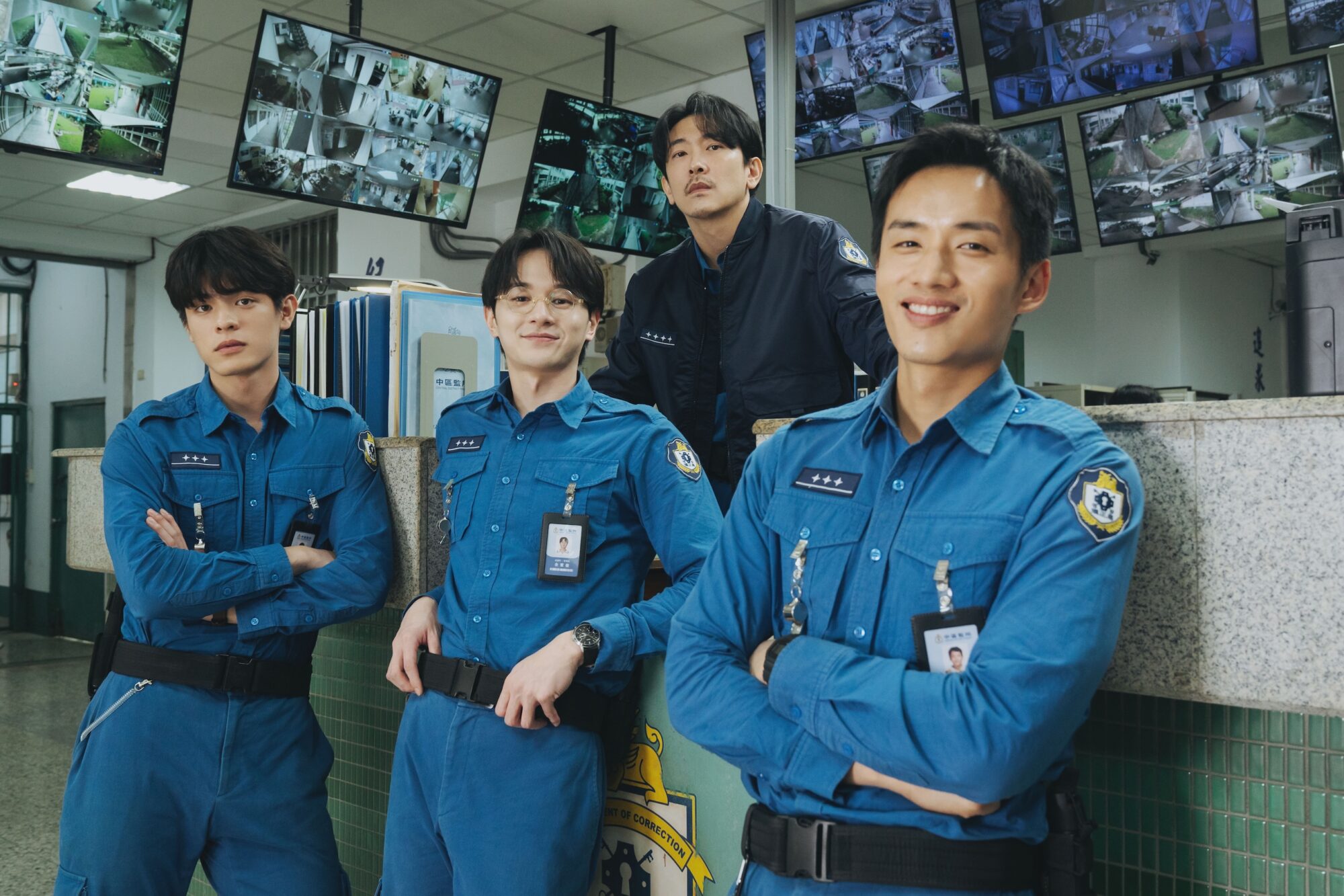 左起邱以太、张轩睿、陈泽耀以及施名帅(上排)在影集中饰演监所管理员。(图/爱奇艺国际版、壹壹影业提供)