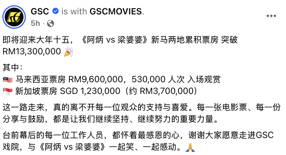 《阿炳vs梁婆婆》马新两地总票房合计高达1330万令吉。