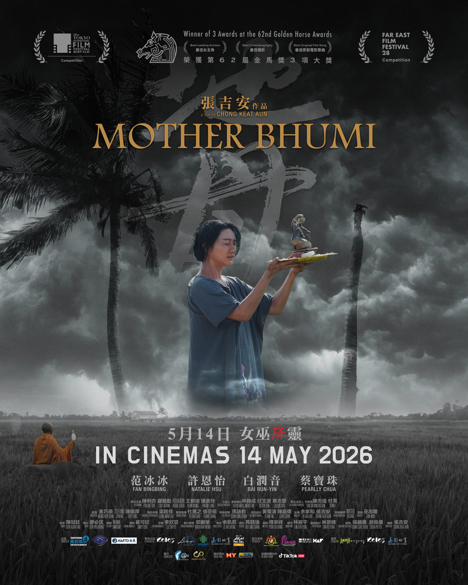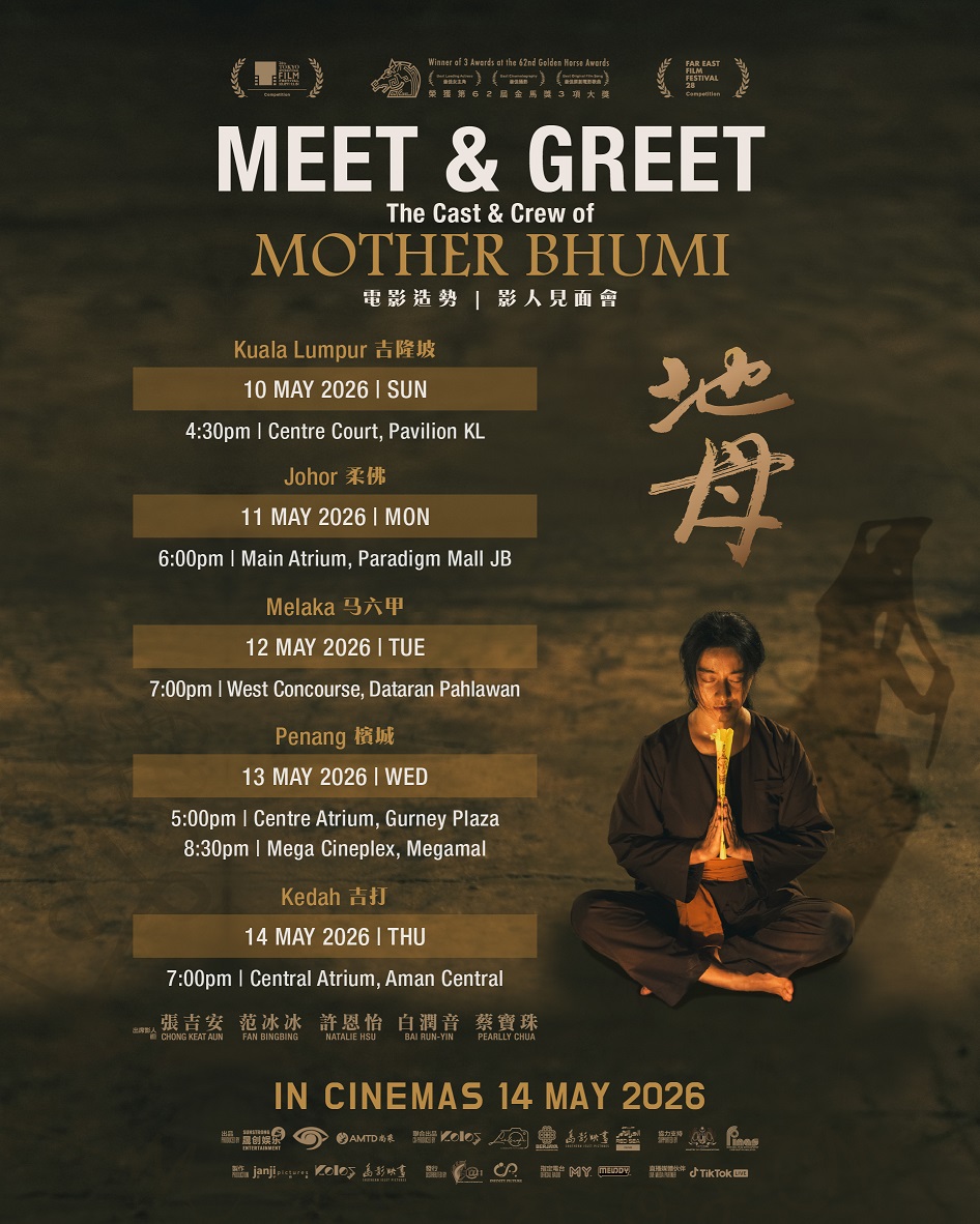 年度乡野魔幻⼒作《地⺟》(MOTHER BHUMI)将于2026年5⽉14⽇全马上映,本片由导演张吉安编导,也是国际影后范冰冰的巅峰之作。从5⽉10⽇⾄14⽇期间,导演张吉安将率领主演范冰冰、⽩润⾳、许恩怡和蔡宝珠,马拉松式地横跨吉隆坡、柔佛、⾺六甲、槟城和吉打5州,与各地影迷近距离互动!